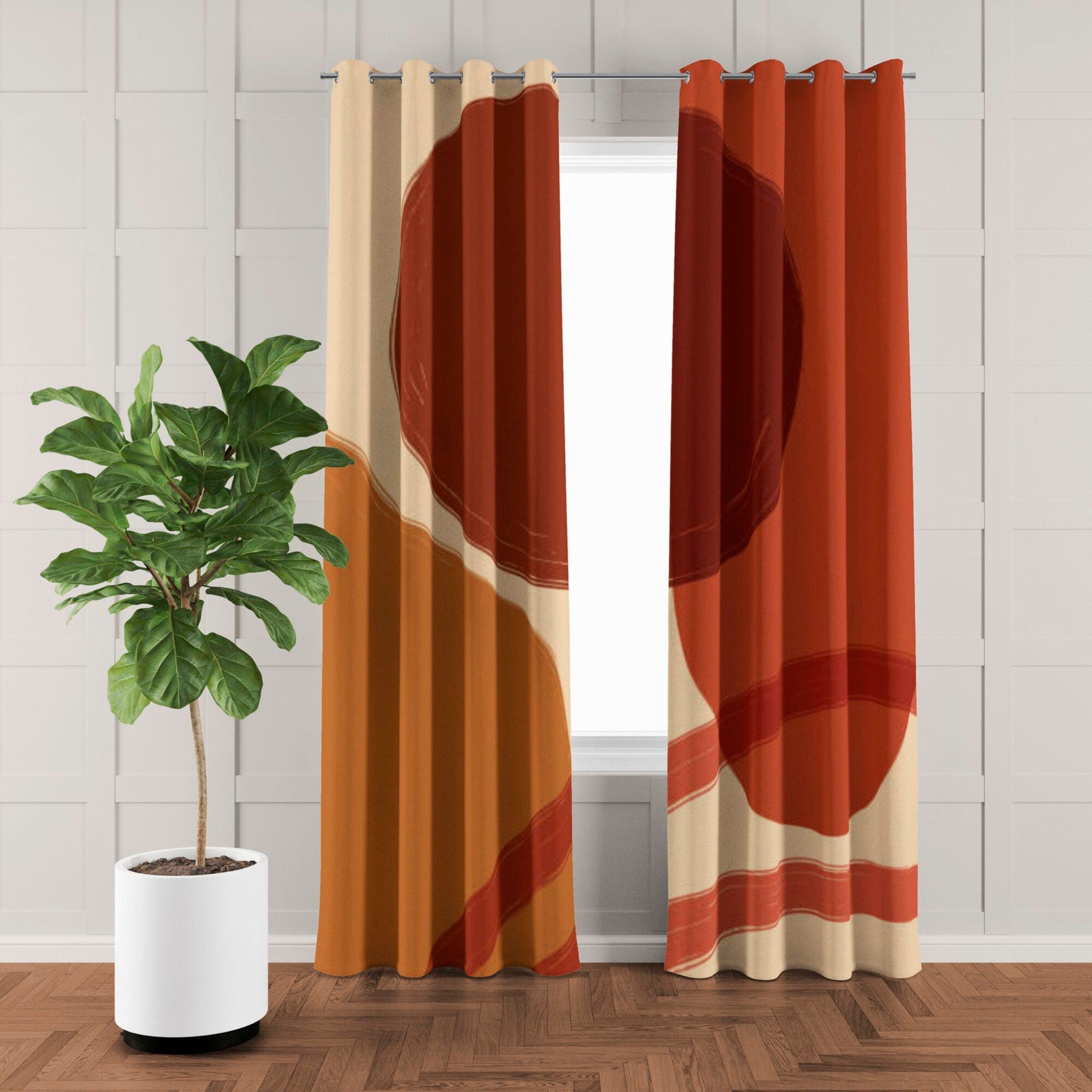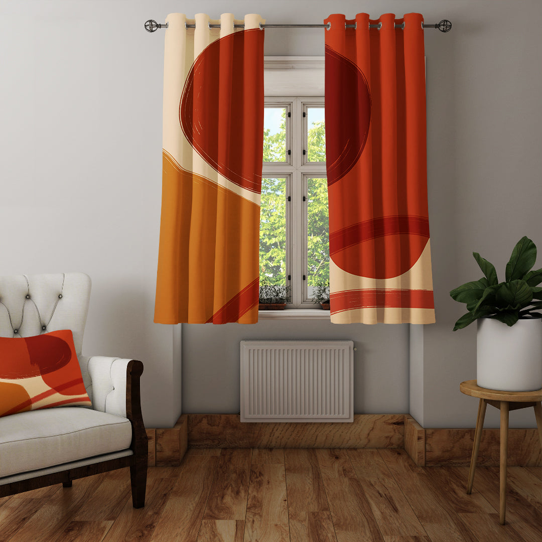 Mid Century Modern abstract geometric design window curtains that will make an unmistakable impact in your room! The warm shades of red, terracotta and orange will add warmth and elegance to any room, such as the living room, bedroom, guest room or office.