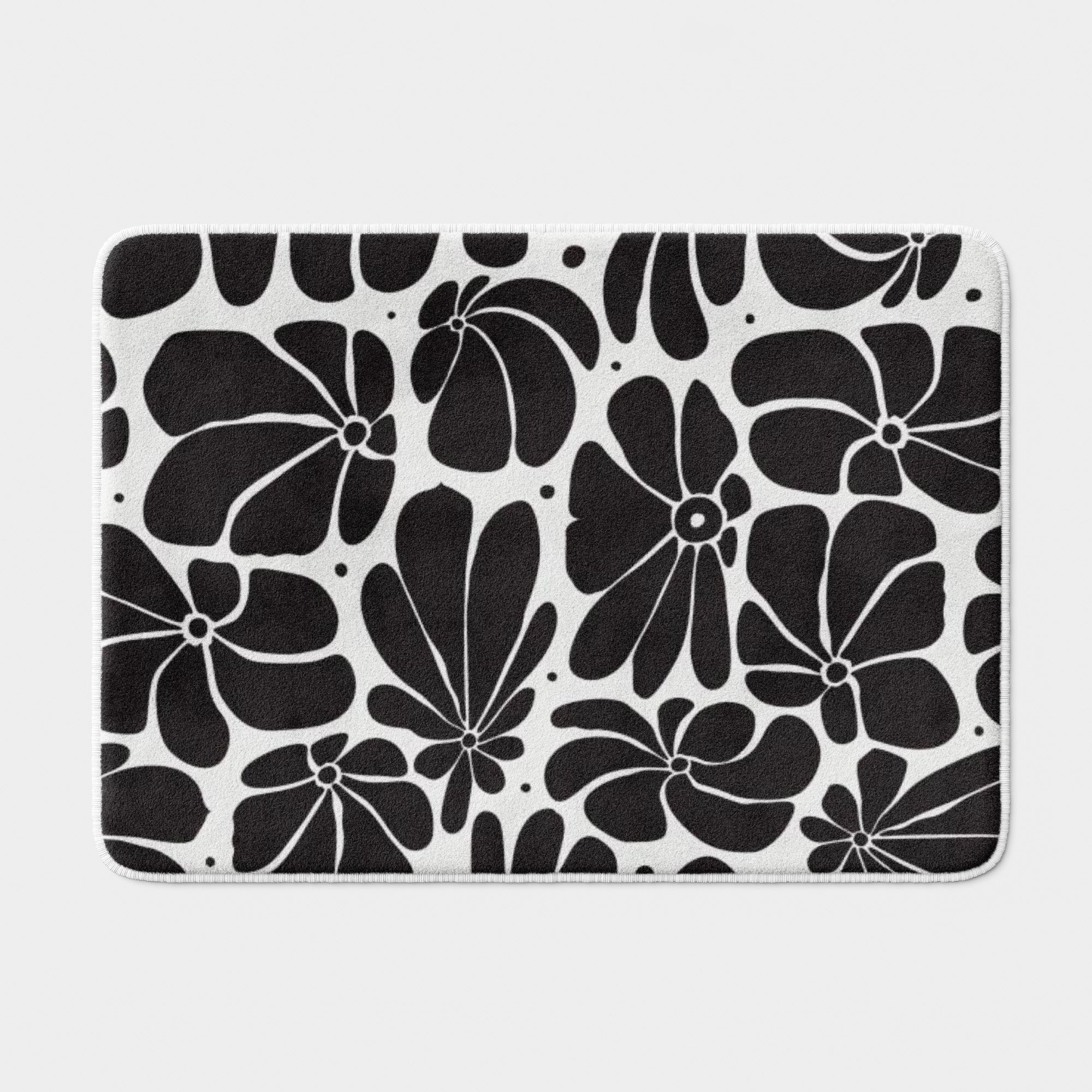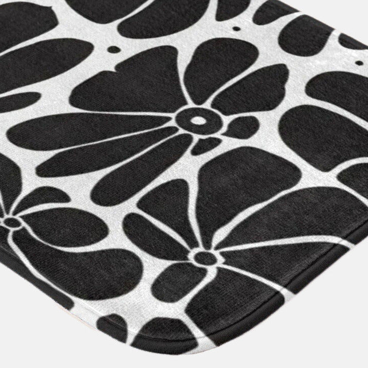 Abstract Black White Retro 70s Floral Bath Mat BLOSSOM