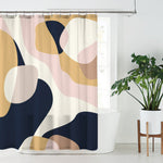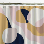 Beautify your bathroom and make it elegant. The TALIA shower curtain with minimalist abstract shapes, in pastel shades, dusty pink, midnight blue, beige and white is designed to give harmony to your bathroom.