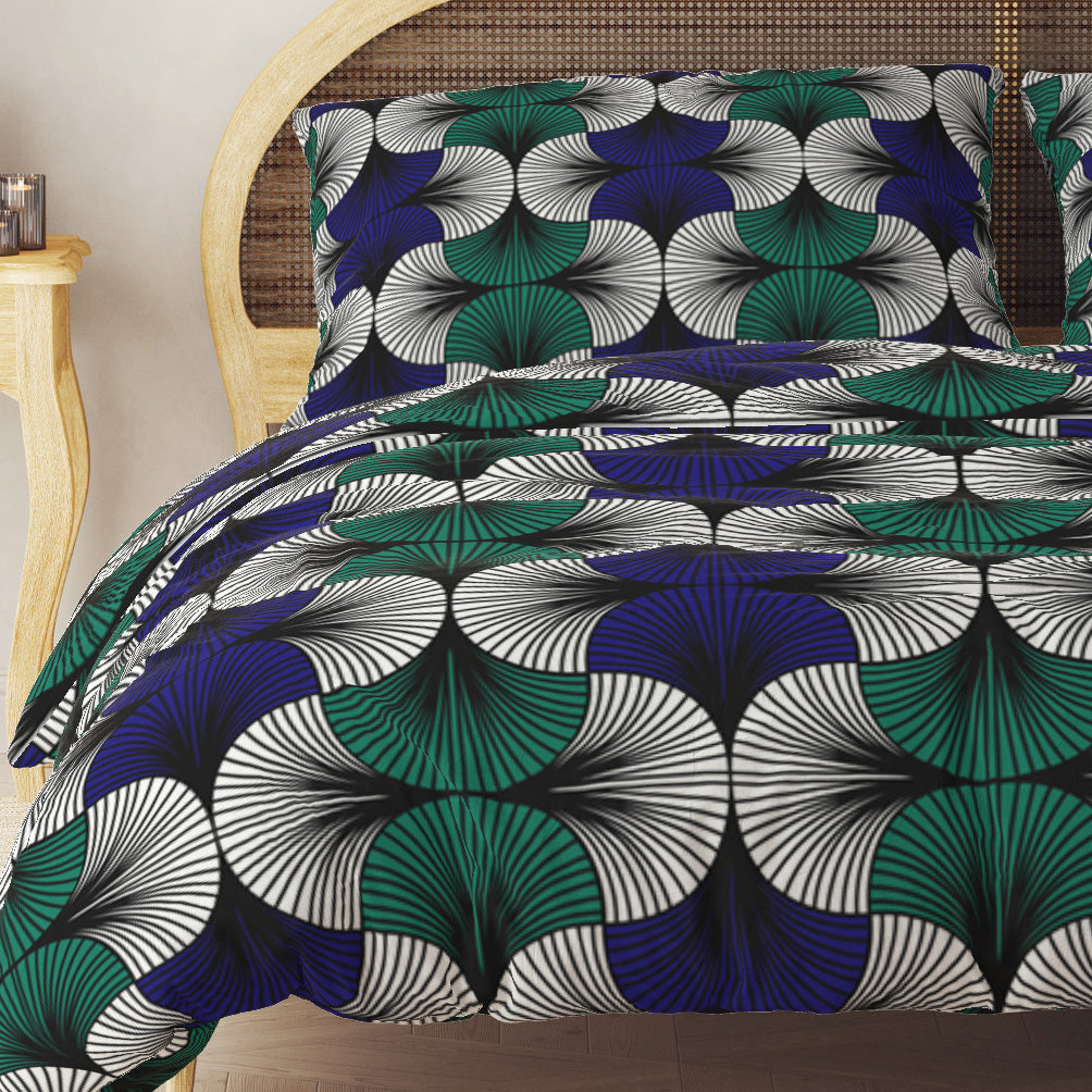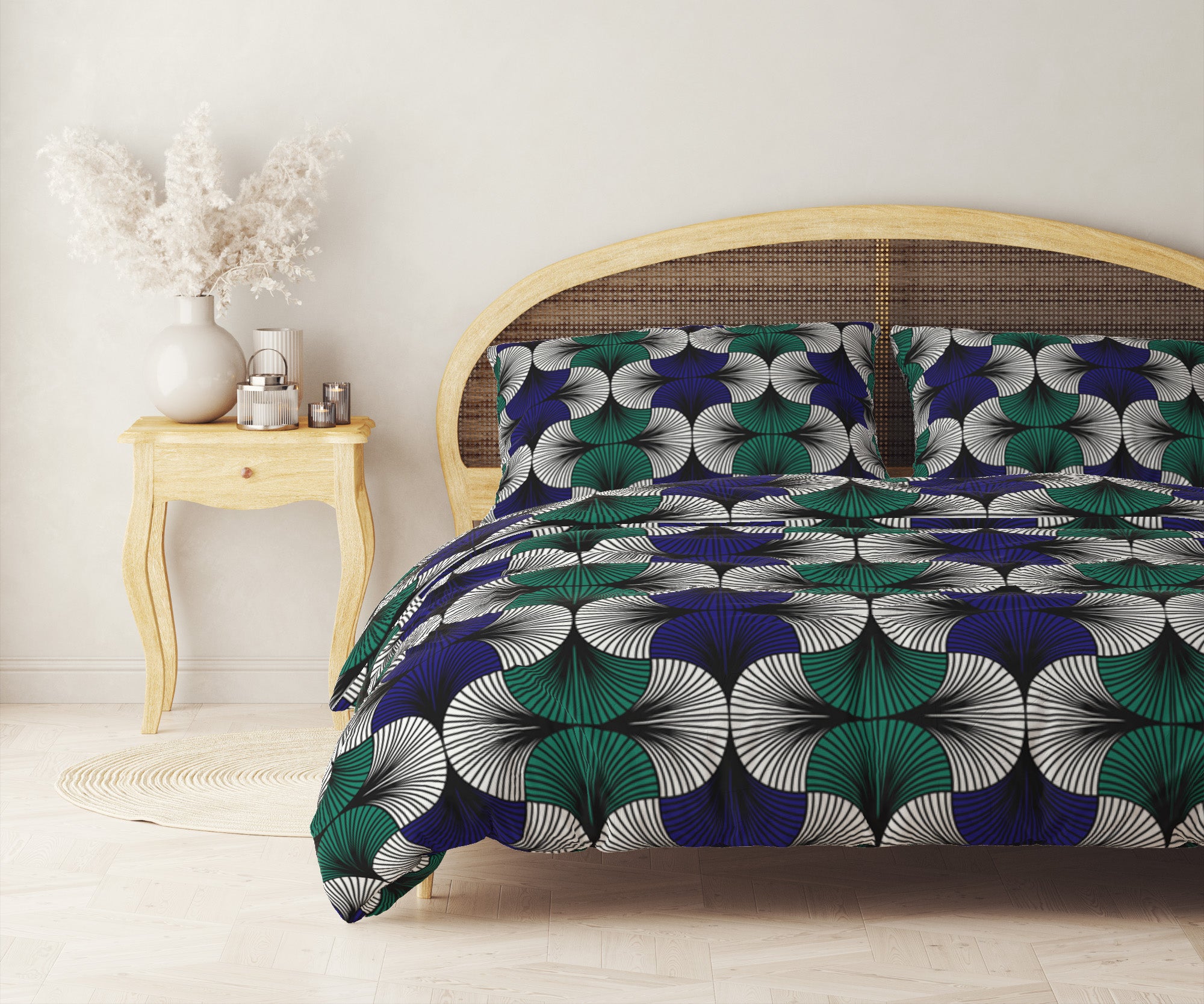 Get inspired and create a totally unique bedroom. The HADIZA duvet cover inspired by the African ethnic Kitenge motif in vibrant green and navy blue is designed to give personality and bring joy.