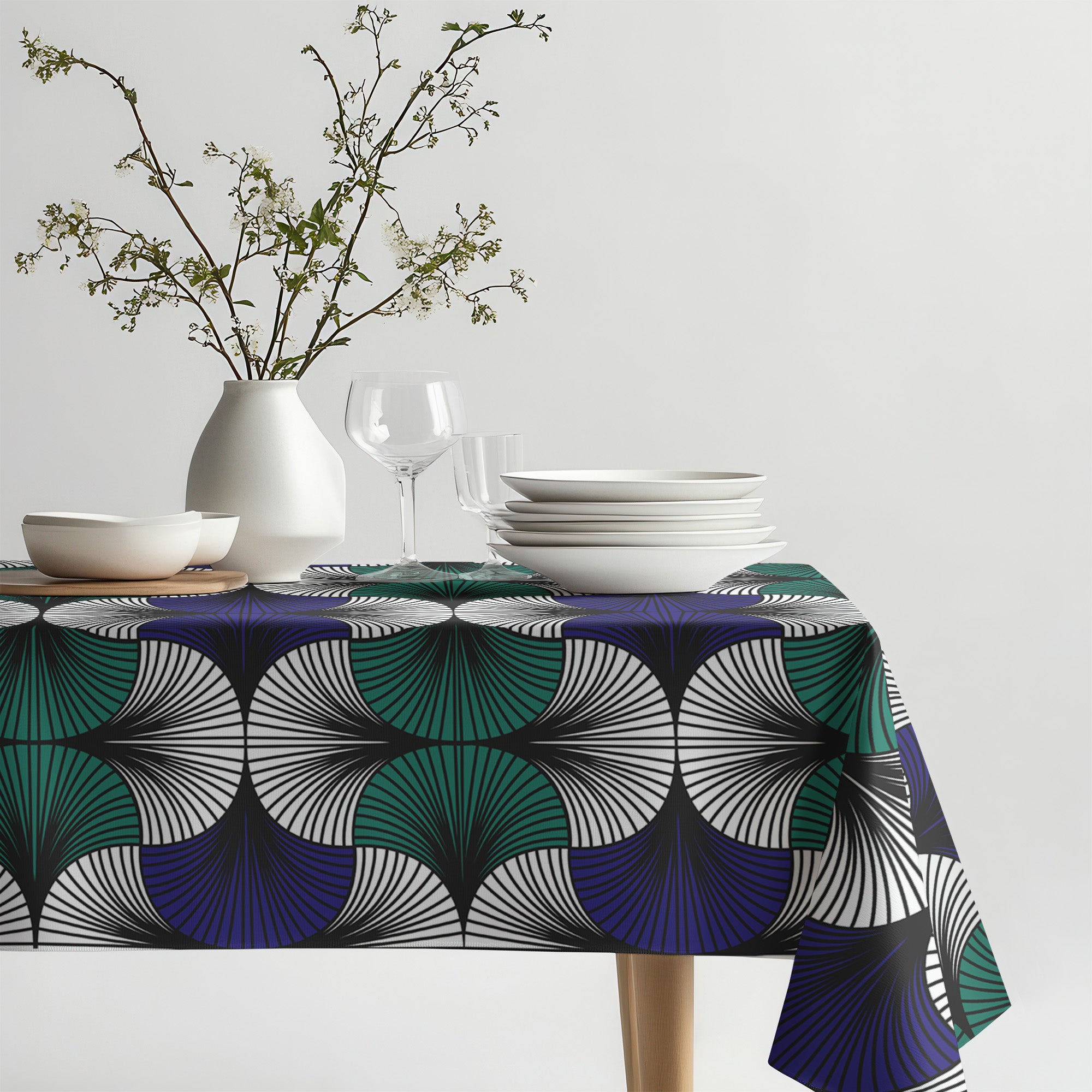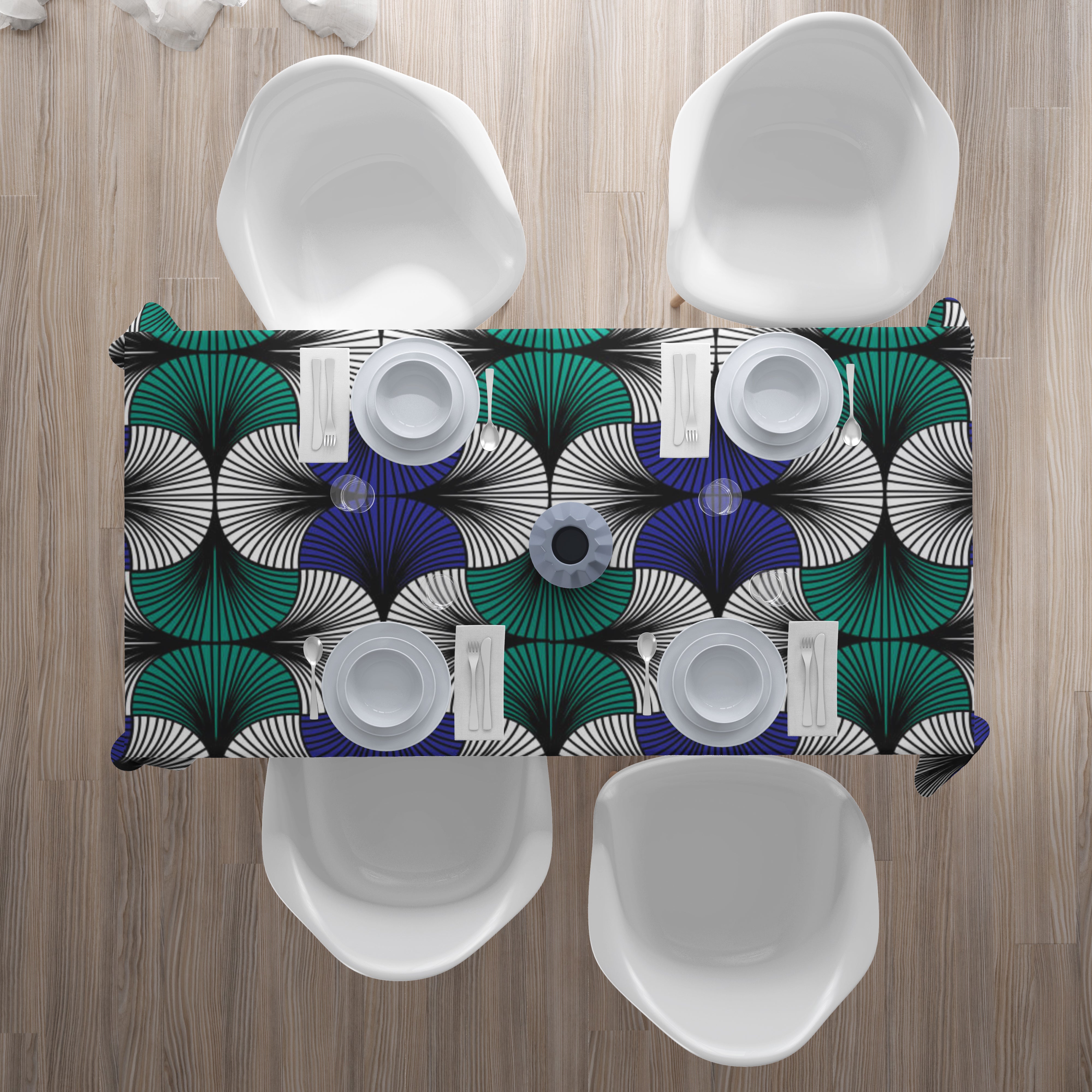 Get inspired and create a totally unique dining room. The HADIZA tablecloth inspired by the African ethnic Kitenge motif in vibrant green and navy blue is designed to give personality and bring joy.