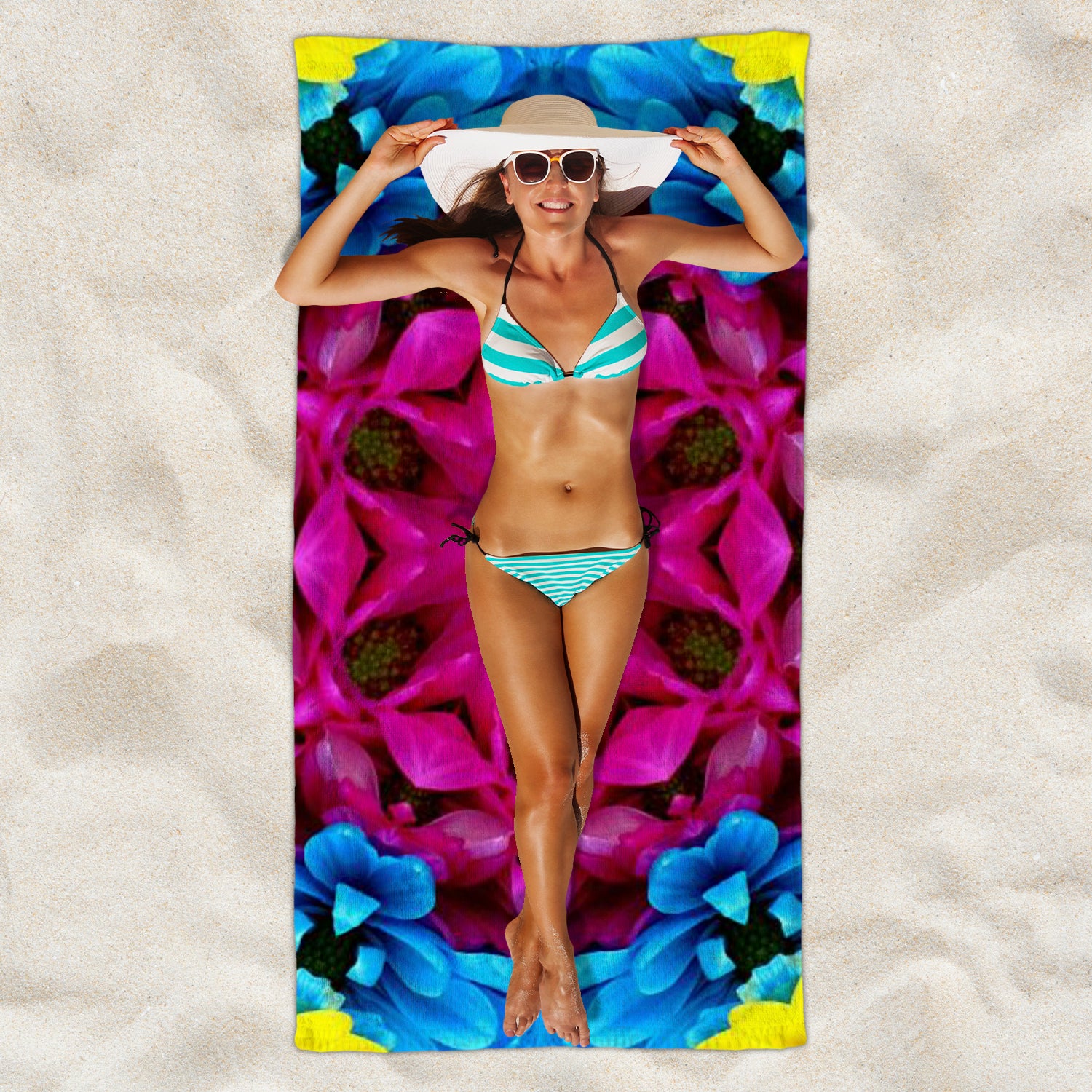 Our large beach towel measures 30 x 60 inch and is perfect for sunbathing on the beach or for a picnic.