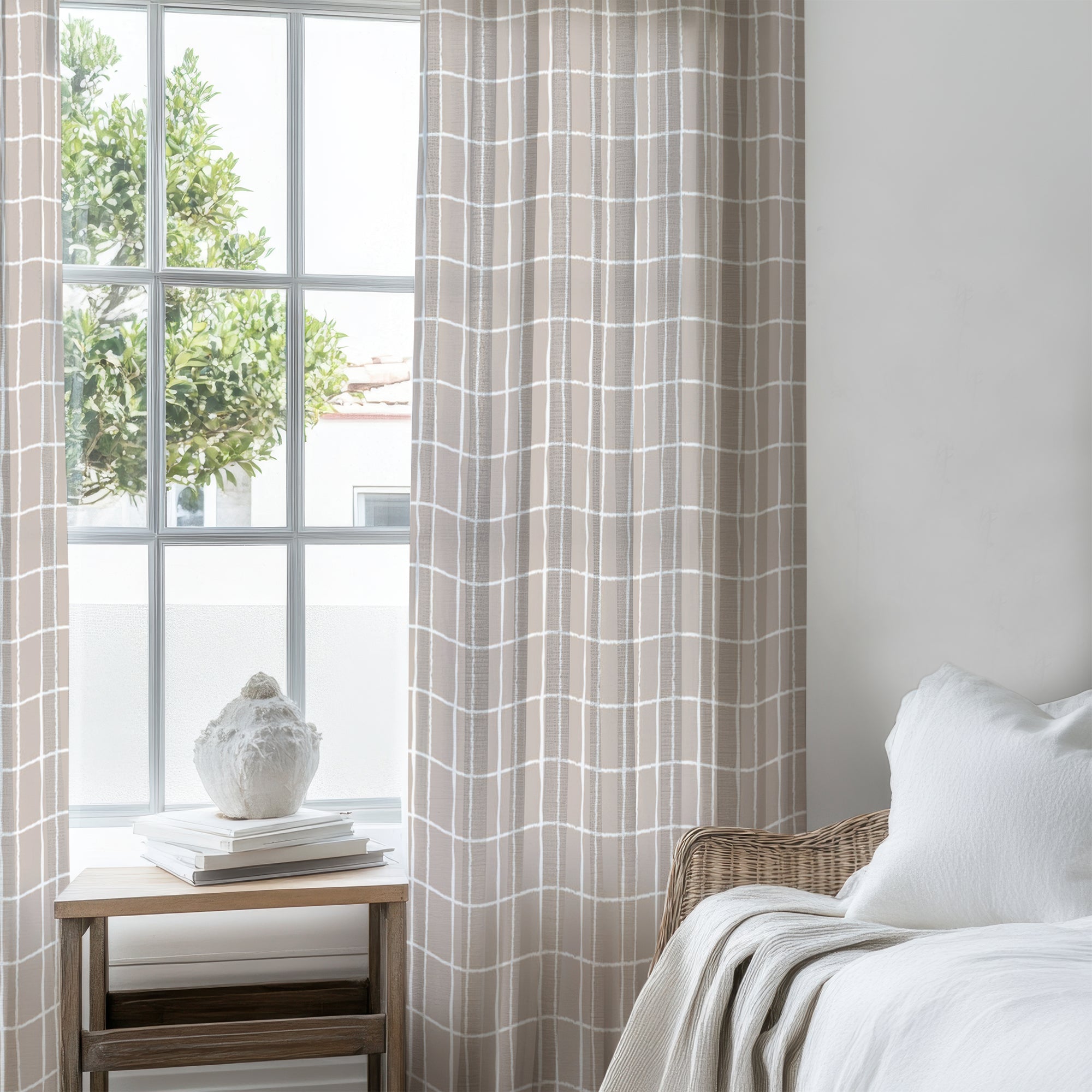 Elegance and versatility with the LORAH curtain in beige and white tones and a geometric checkered pattern, it will give a touch of modernity and style to any room that needs it. Great addition to a rustic farmhouse style decor.