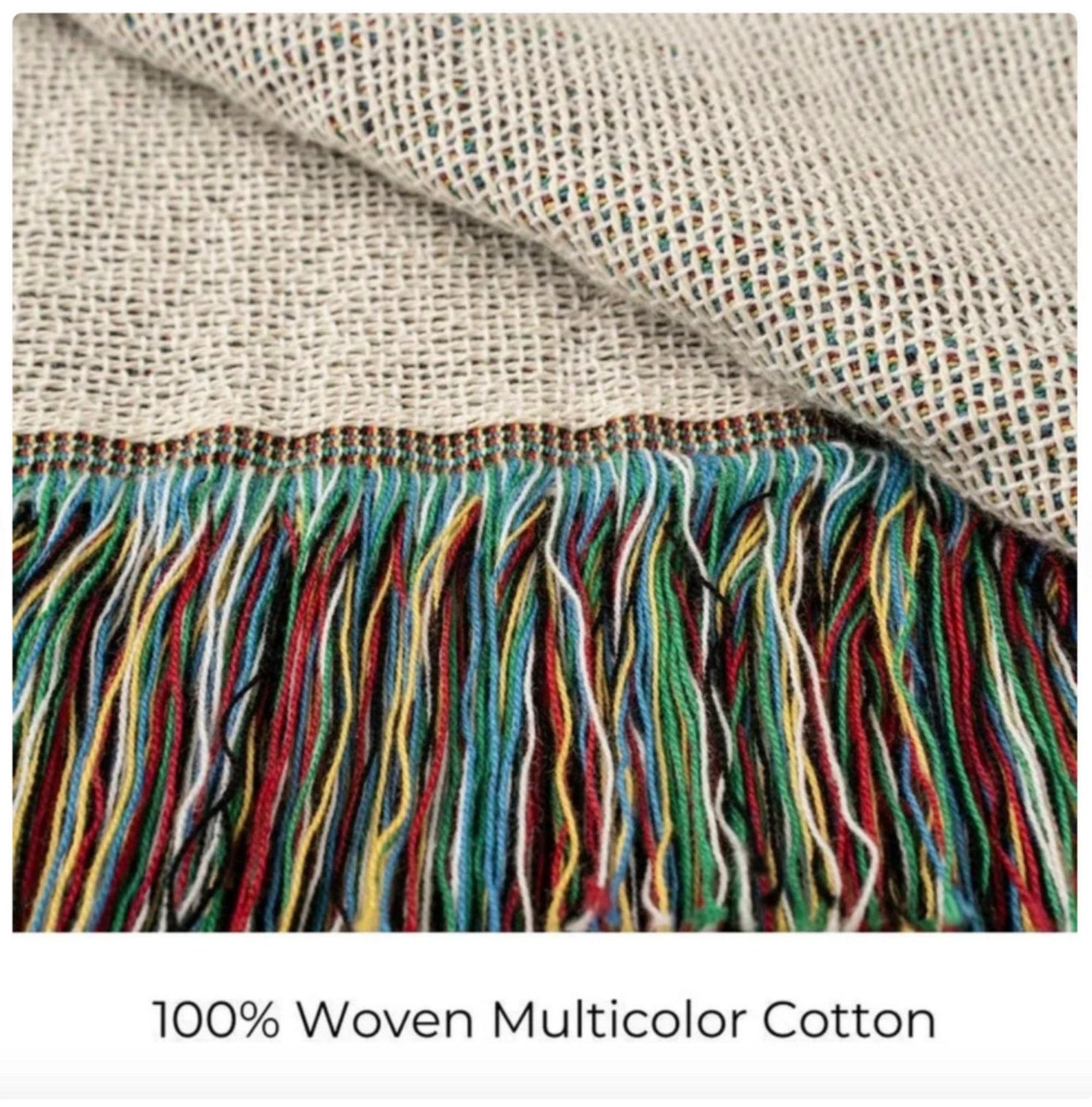 Made from 100% pure cotton thickened thread with multicolored fringed edges, the coziest of home accessories. The back side is a negative-color image of the design. Perfect addition to any living room sofa or to decorate your bed, to make a great impression on a picnic or camping outdoors, make a unique housewarming gift and is an absolute must for anyone who loves to drink coffee or a cup of tea in a cozy way! Also ideal as a tapestry to hang on the wall for a great look.