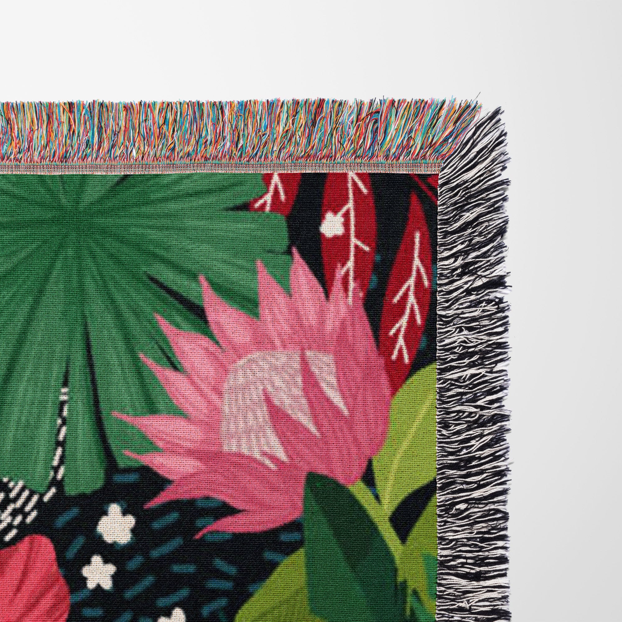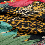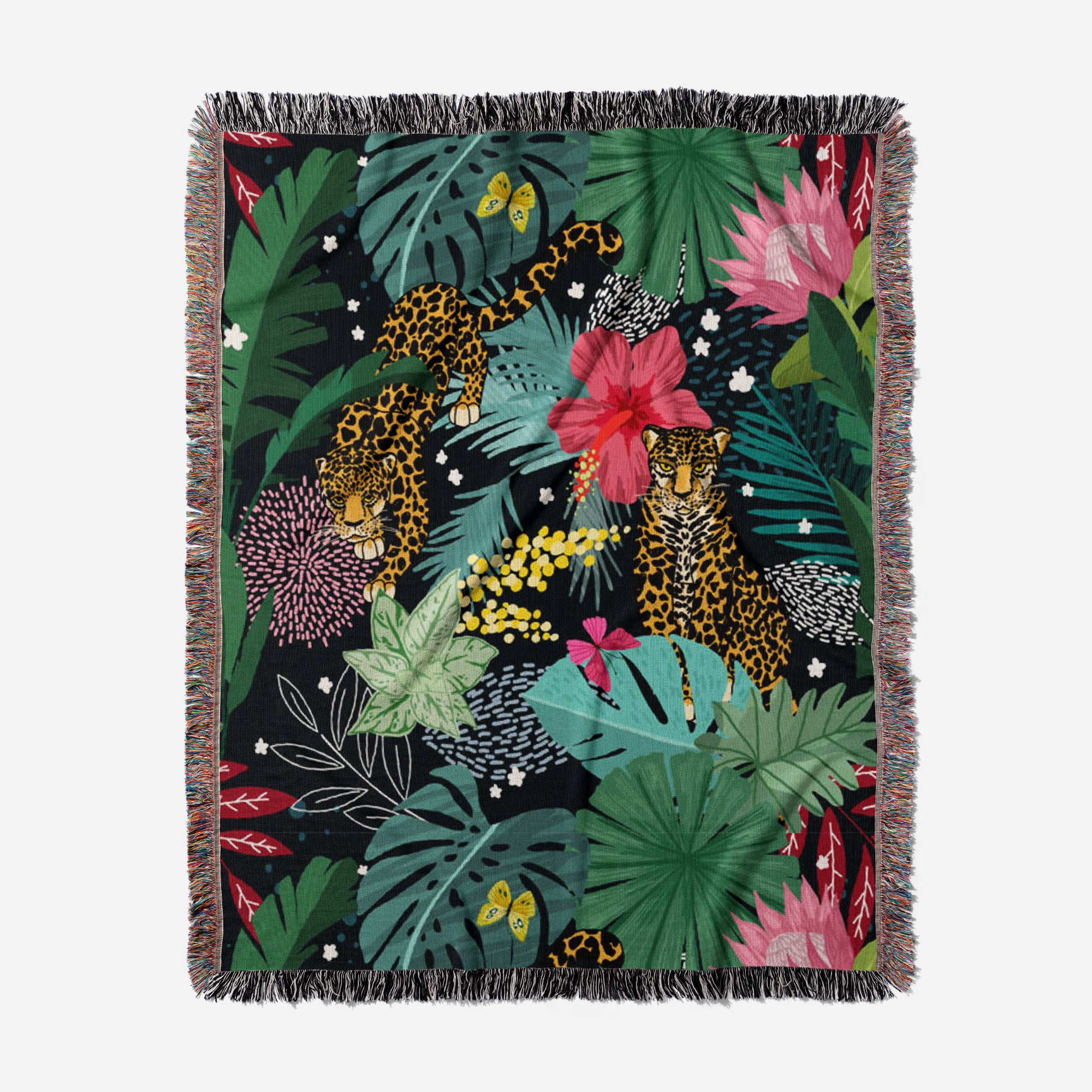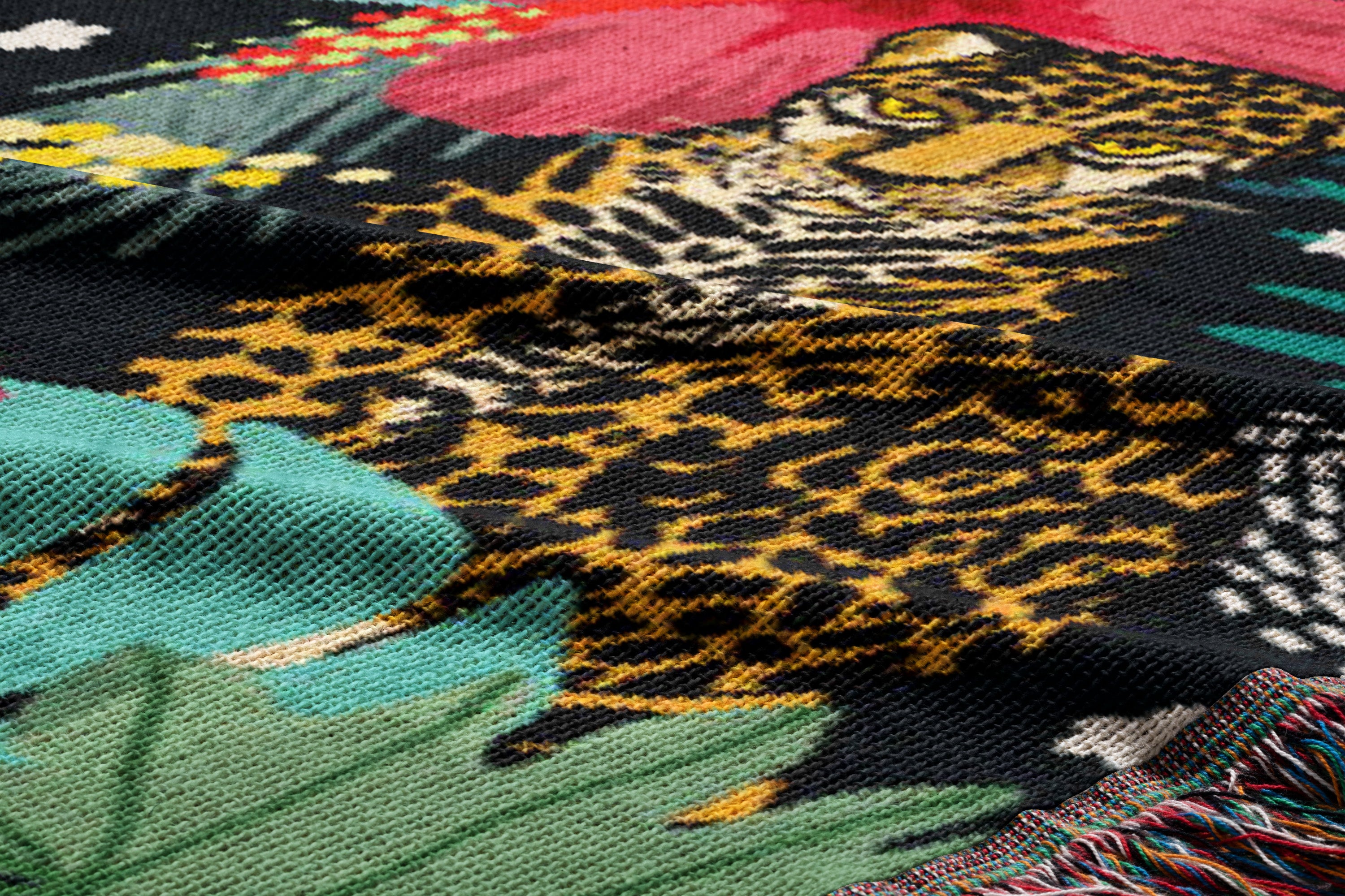JAGUAR print knitted woven blanket with tropical jungle art.