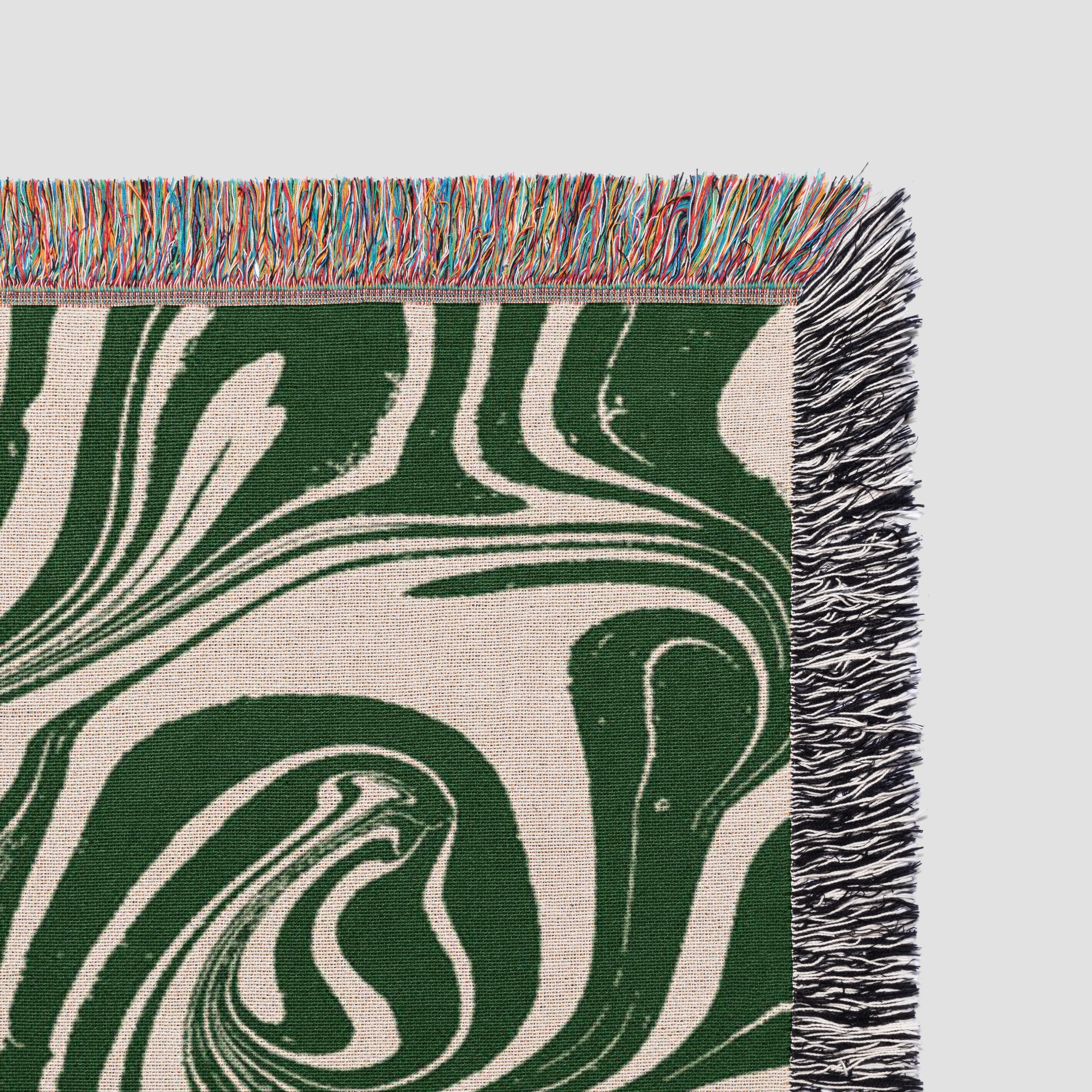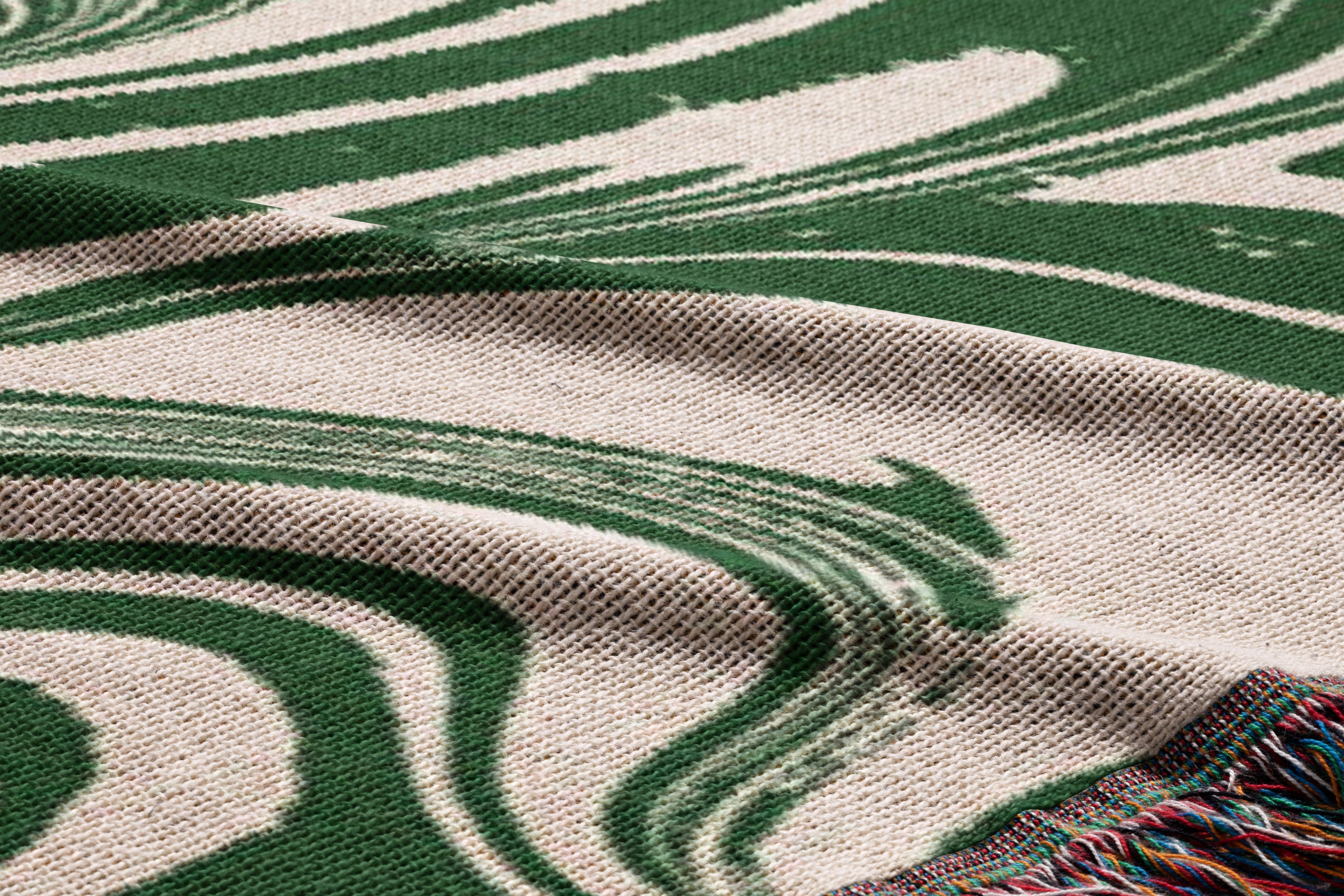 Knitted woven blanket with an OLIVE print, featuring marble-green abstract waves in a retro-inspired style.