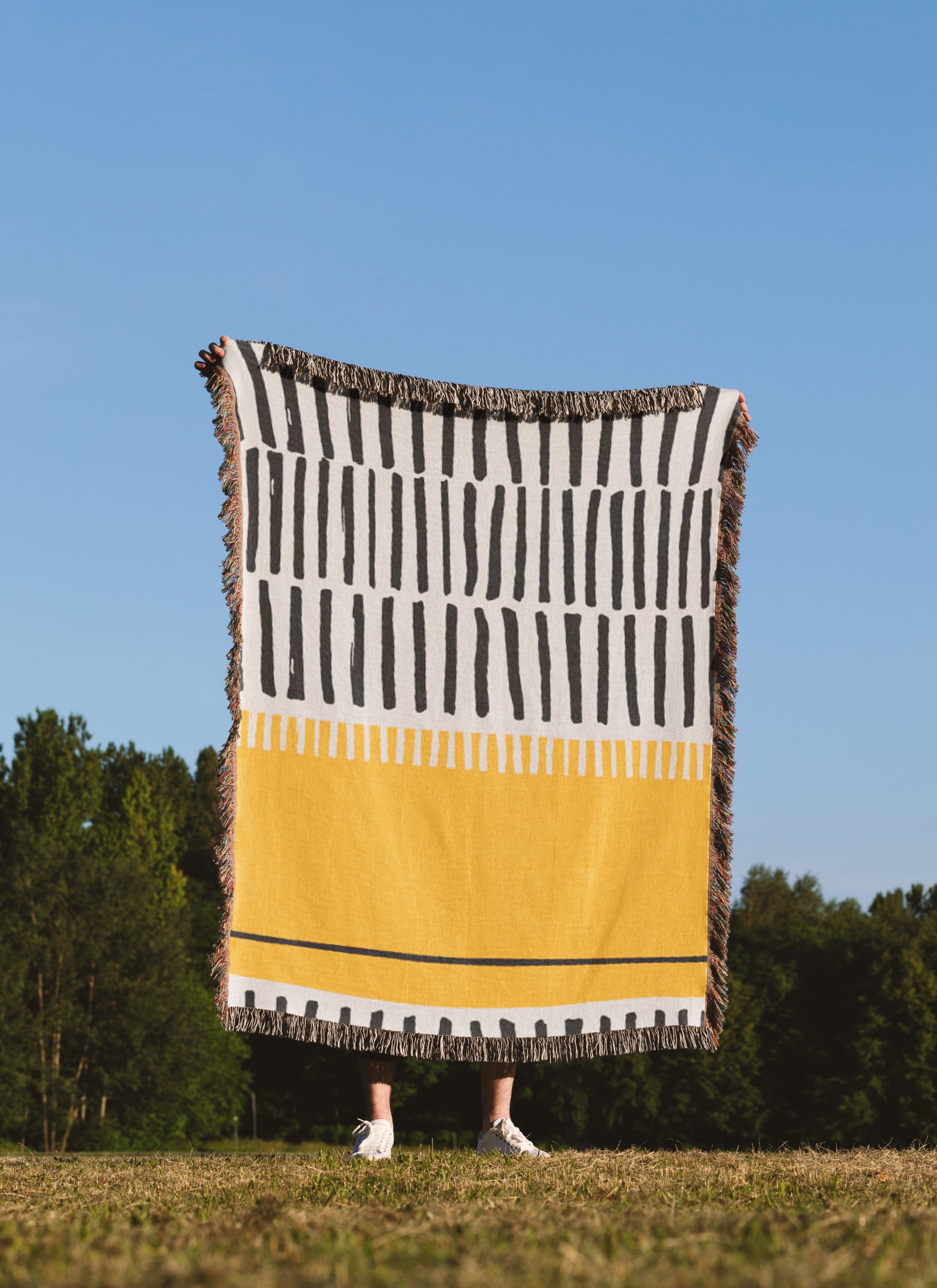 Knitted woven blanket with NAGY print inspired by Mid-Century geometric abstract art.