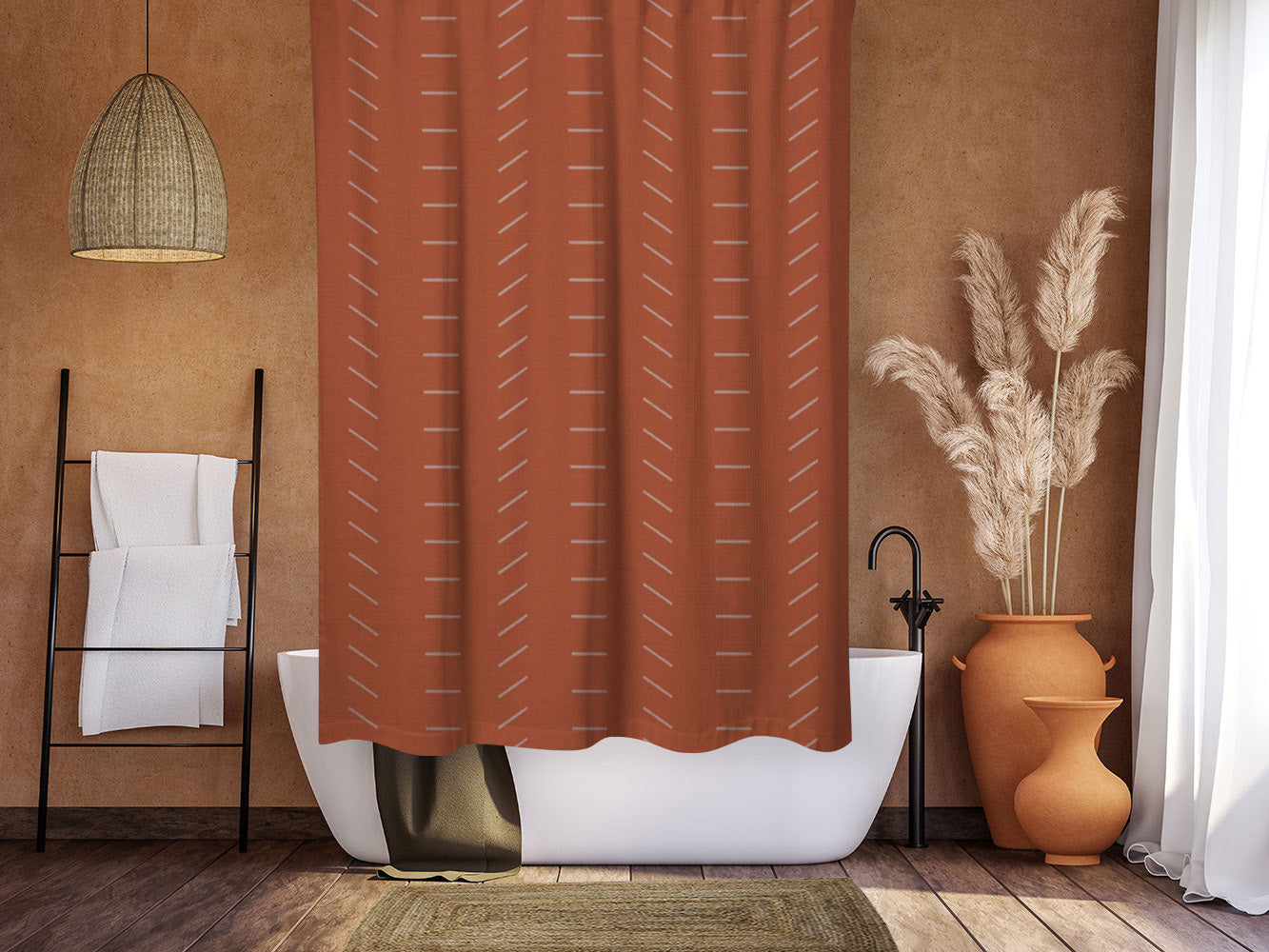 Get inspired by NIAMEY shower curtain, the minimalist geometric pattern with burnt orange terracotta background brings warmth and a truly unique look to your bathroom making it stand out.