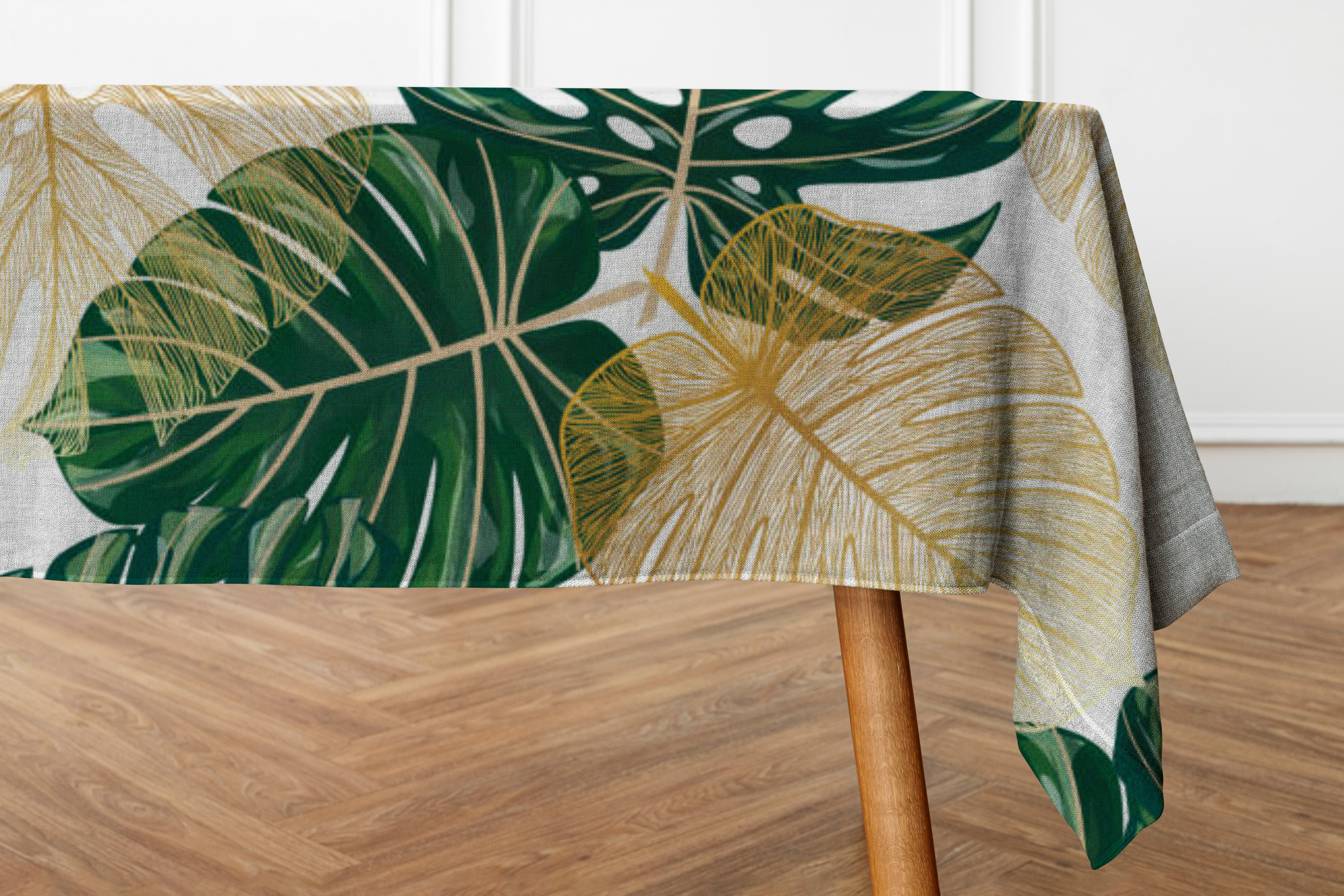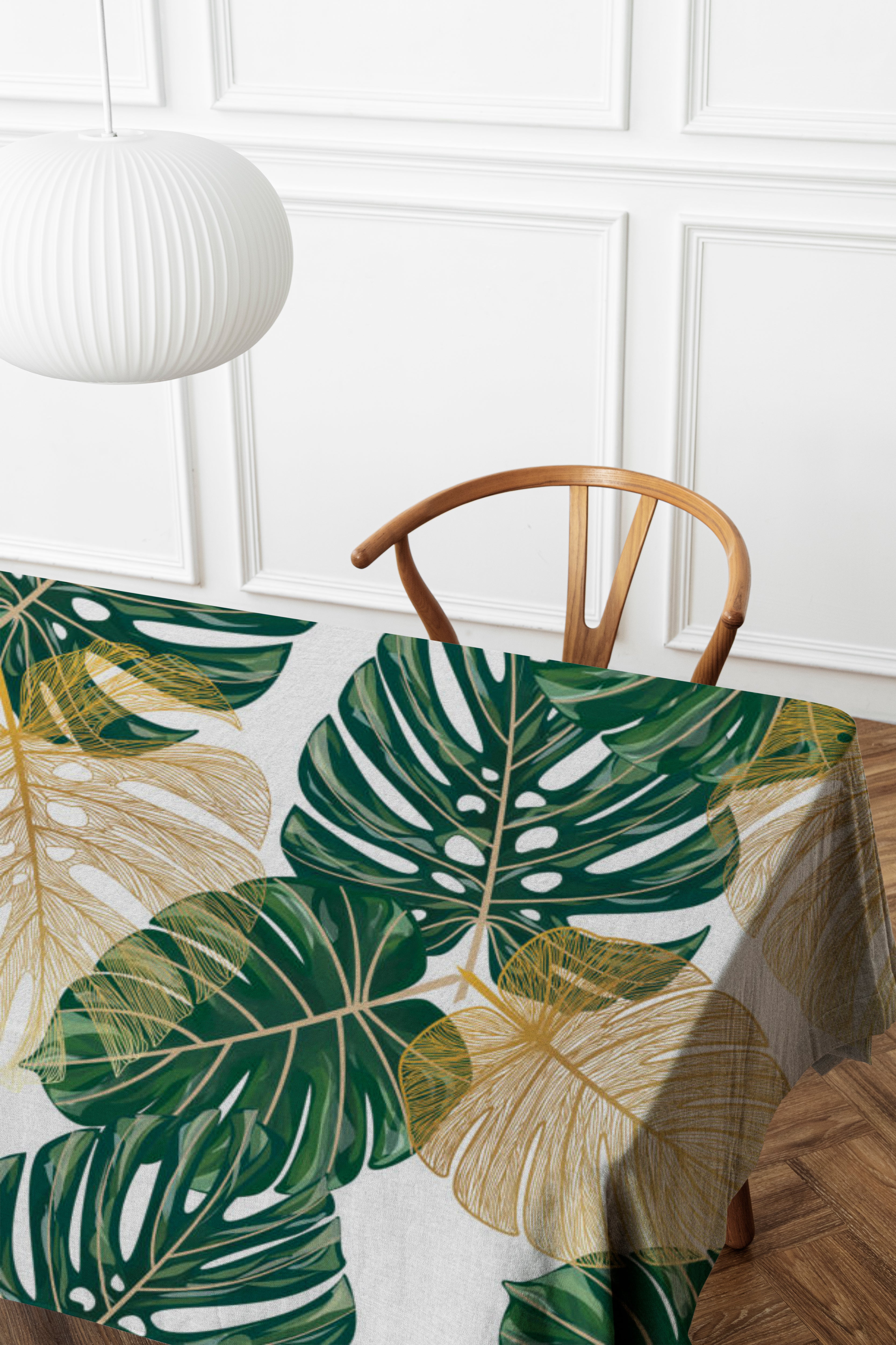 Liven up your dining room with the tropical elegance of KAUAI tablecloth on white background and shiny golden and green Monstera leaves.