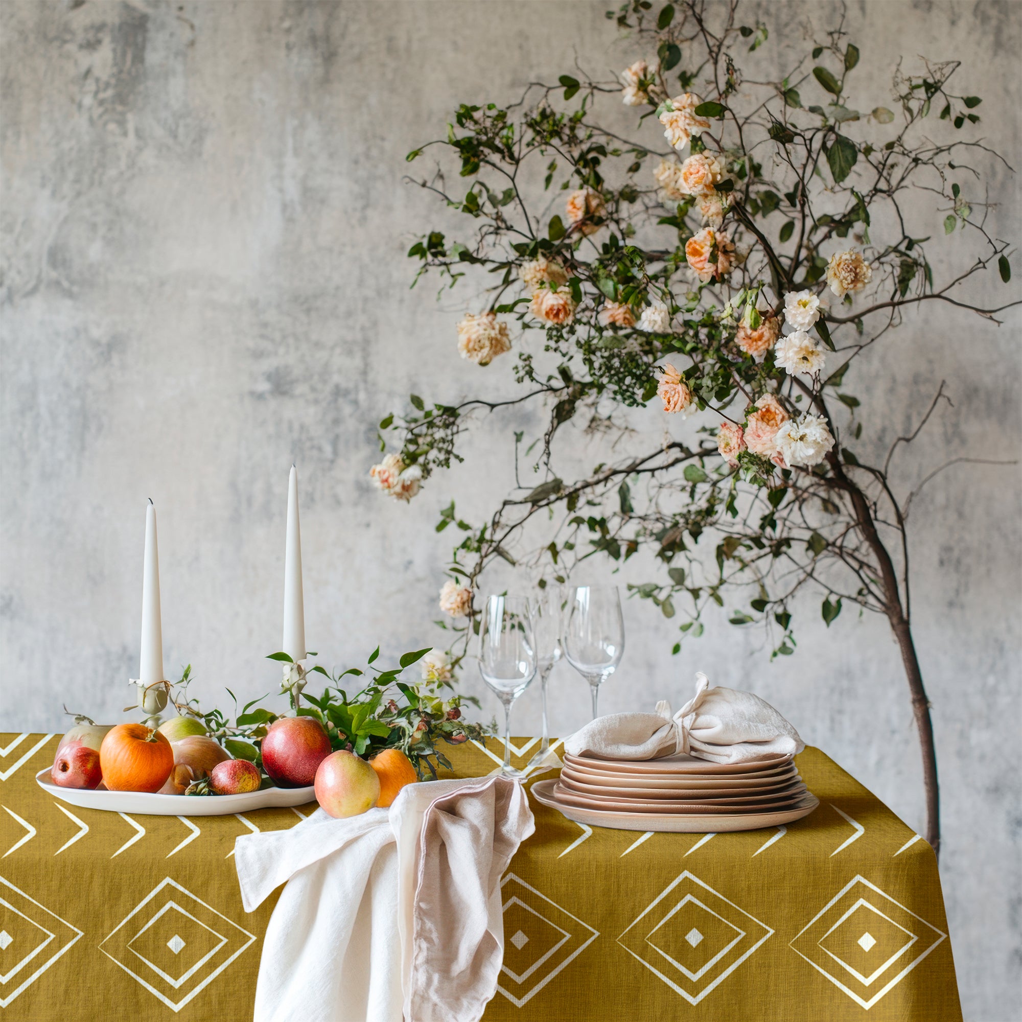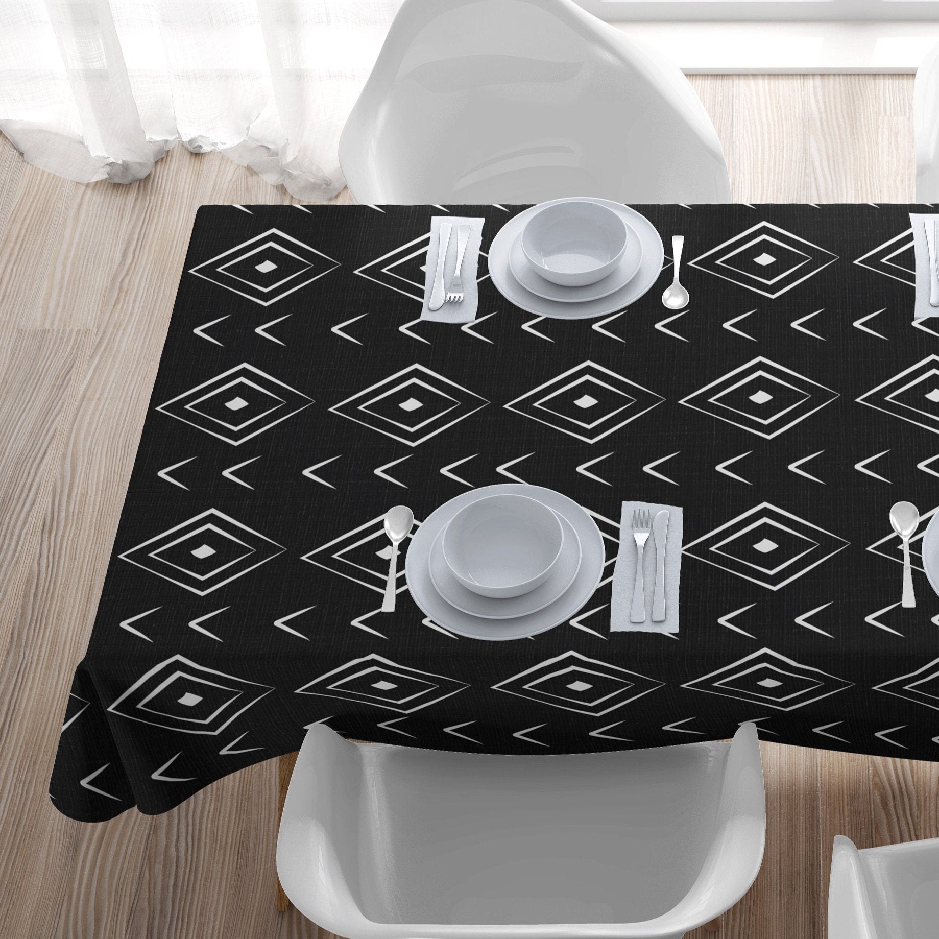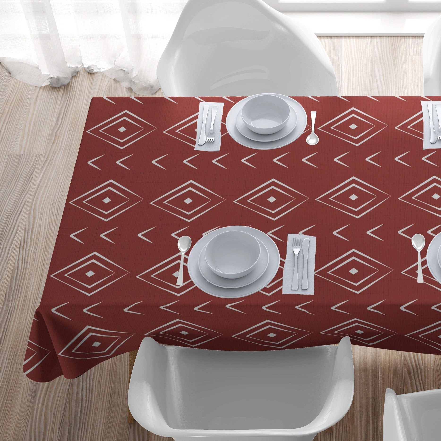 Get inspired by NARA tablecloth with African ethnic print, the solid colors and the geometric mudcloth print make it a unique detail for your dining room.