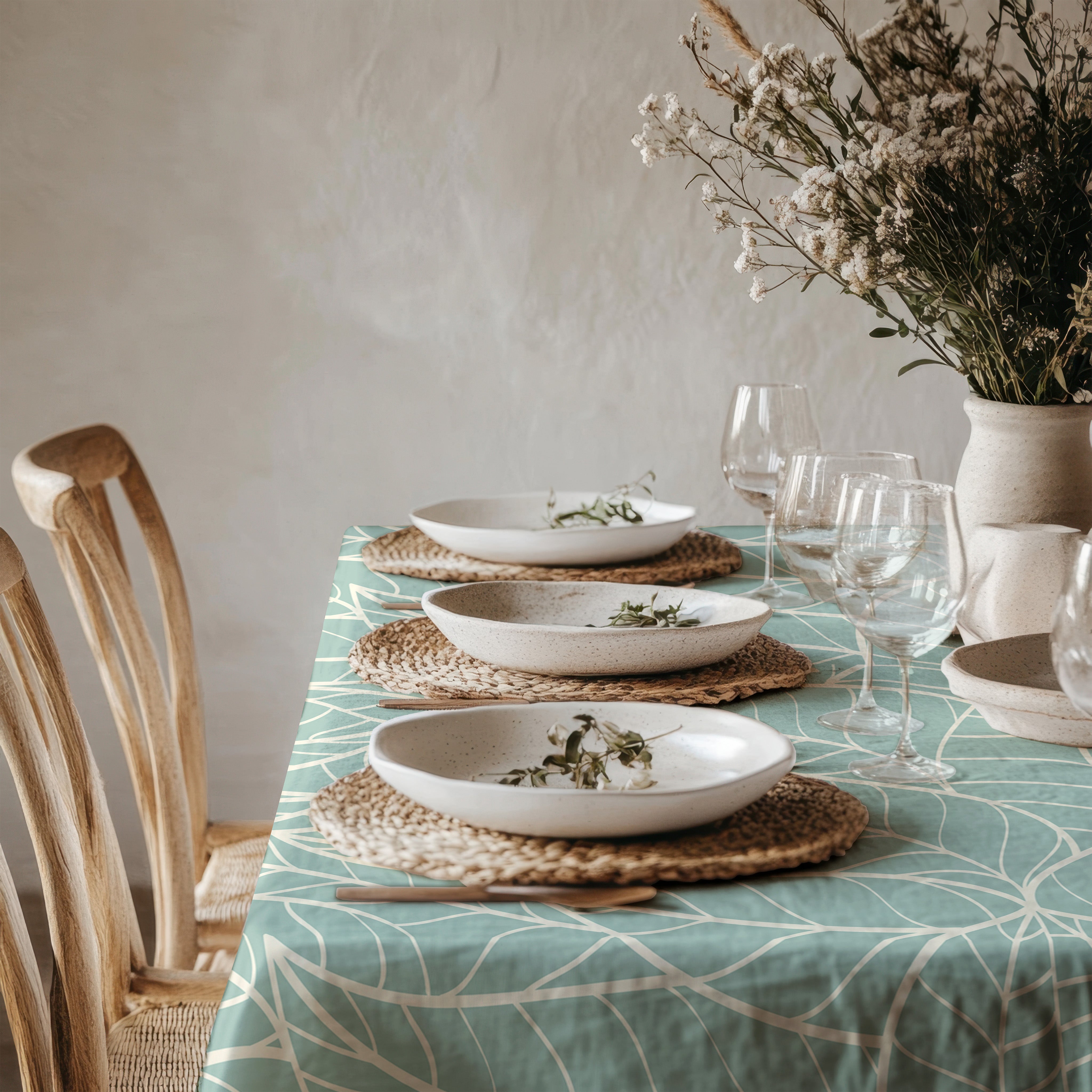 Give a fresh and delicate look to your dining room with the BETTY mint green and white botanical tablecloth.