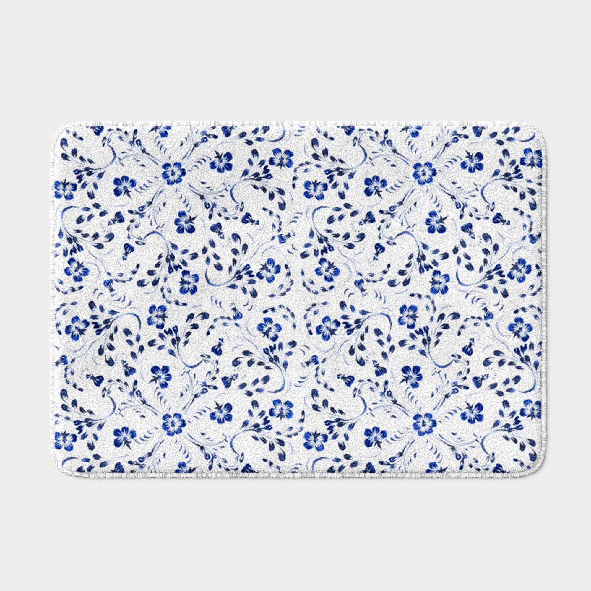 Navy Blue White Periwinkle Flowers Botanical Floral Bath Mat KARINA