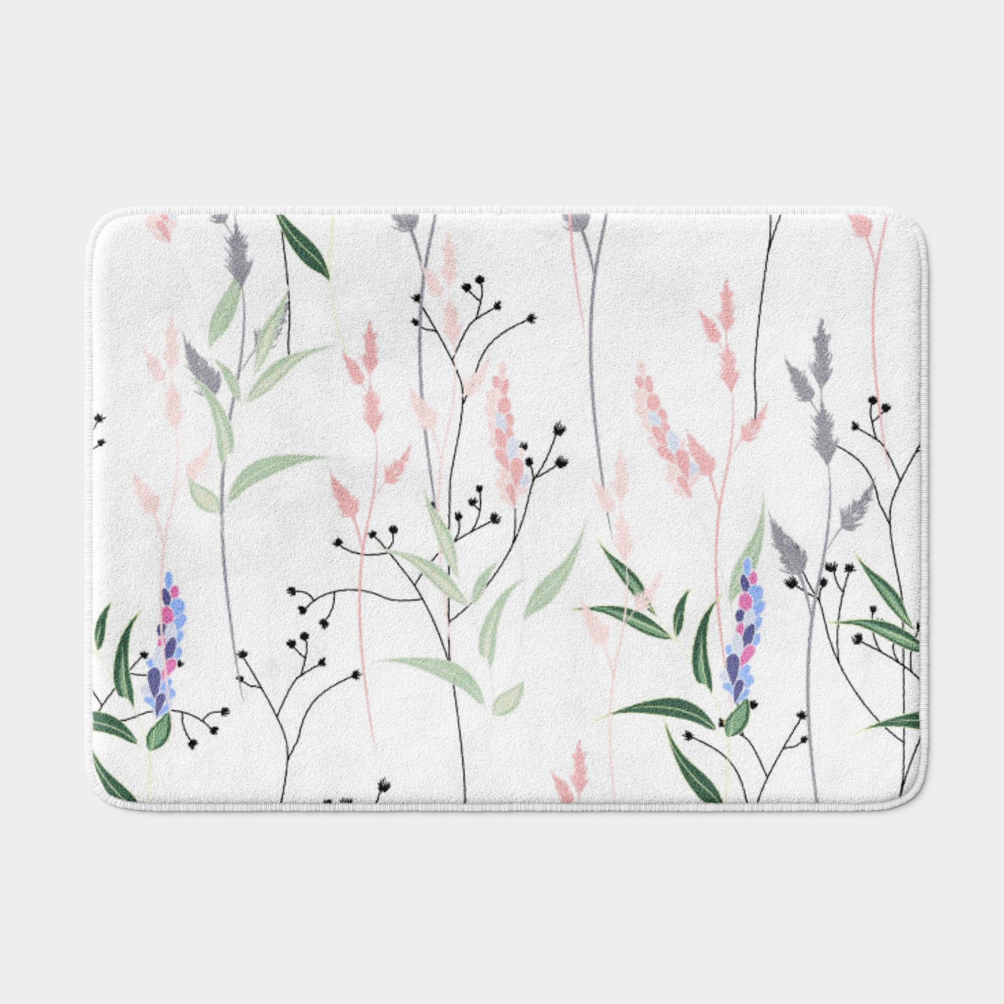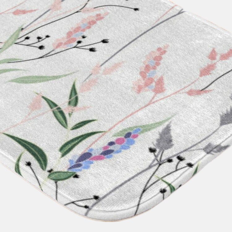 Pastel Tiny Wild Flowers Grasses White Botanical Floral Bath Mat INES
