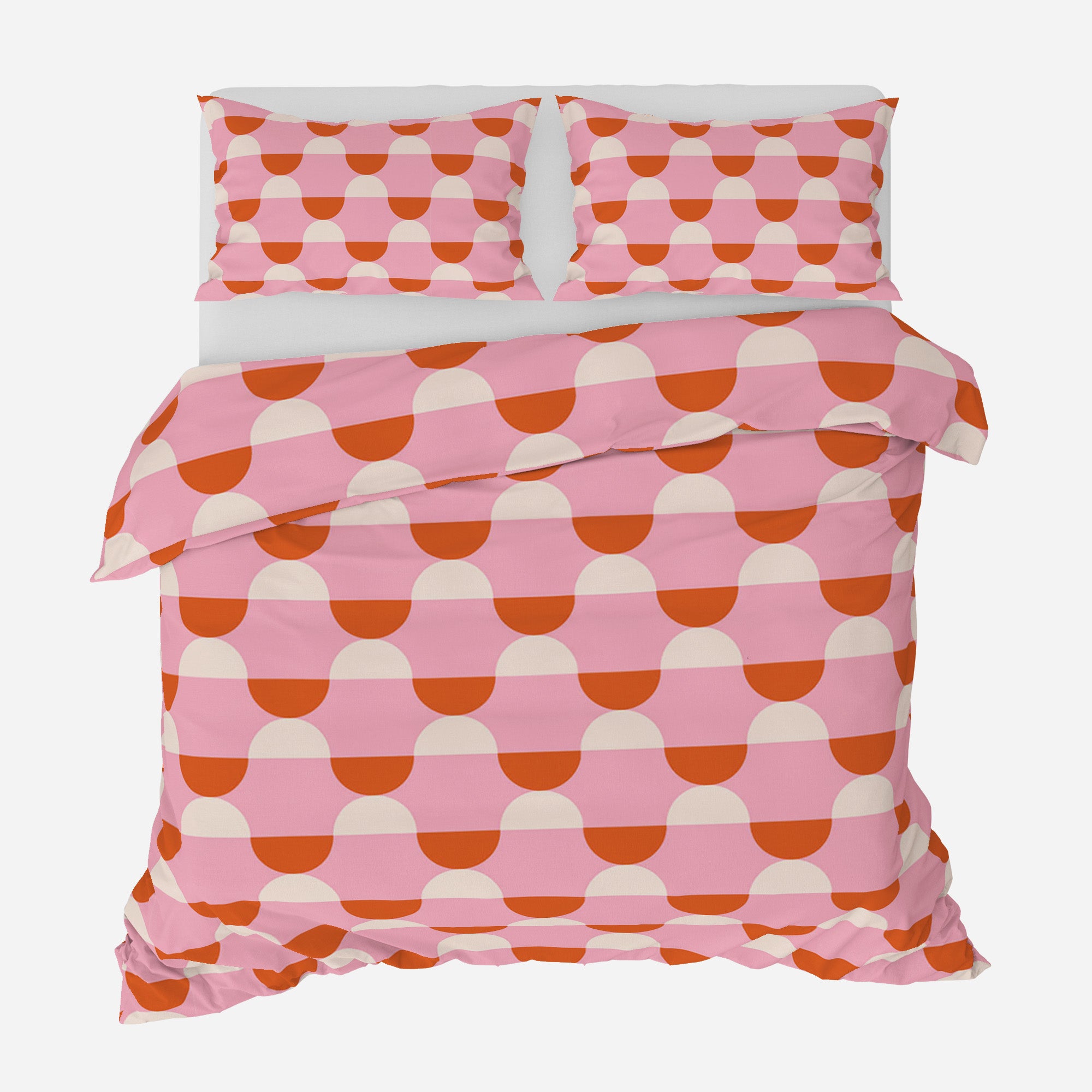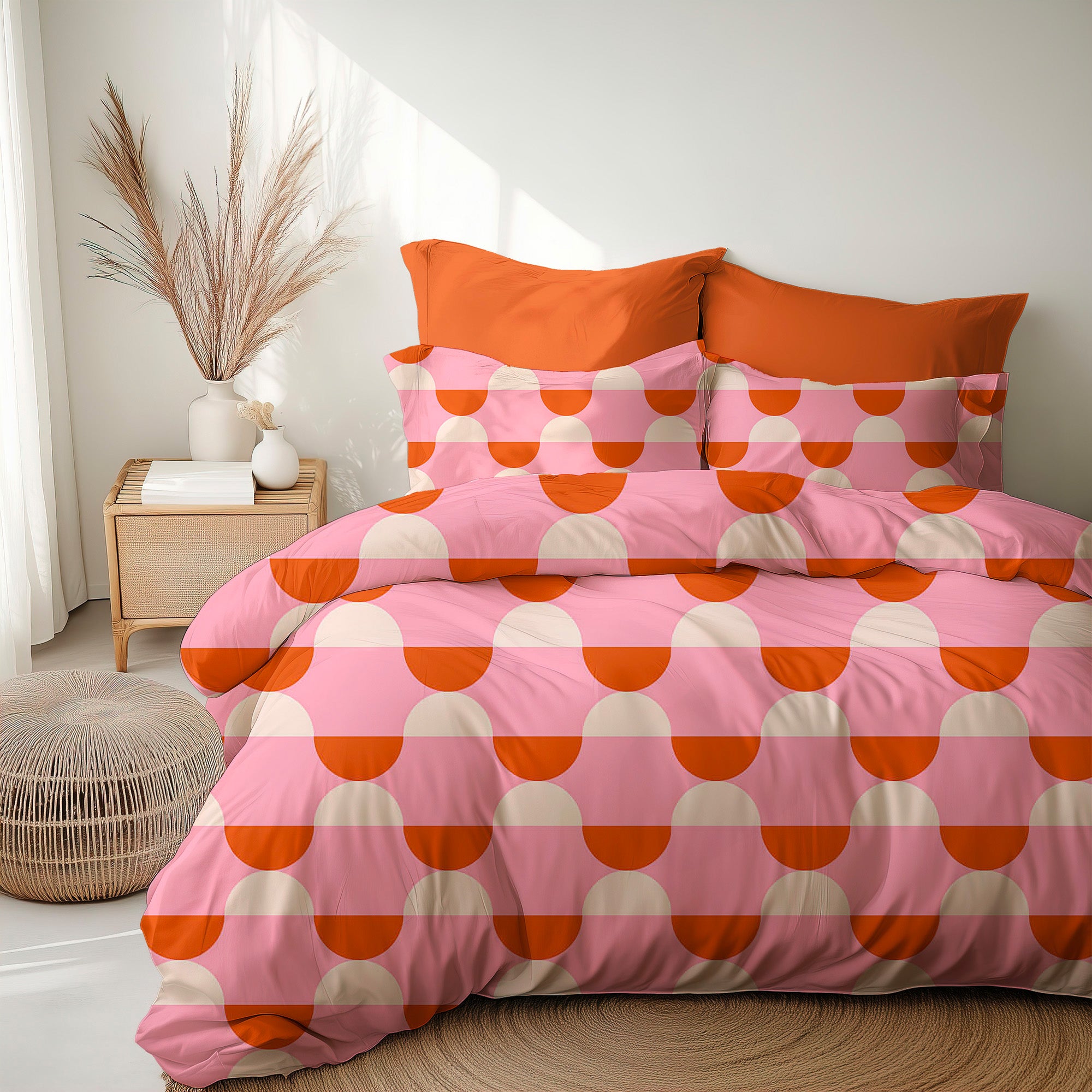 The bold abstract shapes in warm orange, playful pink, and soft beige of this retro-inspired duvet cover set add joyful energy to your bedroom. Your bed becomes a comfortable canvas for personal expression thanks to its maximalist design and breathable cotton fabric. Because comfort ought to be as pleasant as it is to look at.