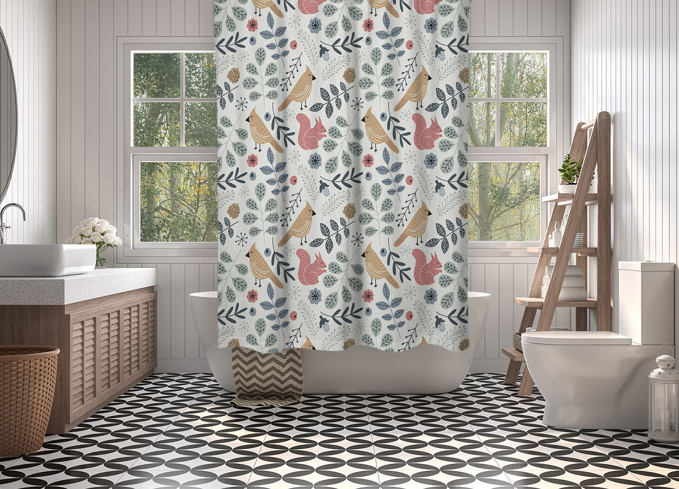 Bring some Scandinavian folk art into your bathroom and experience the fairytale woodland with the SKOGEN farmhouse shower curtain.