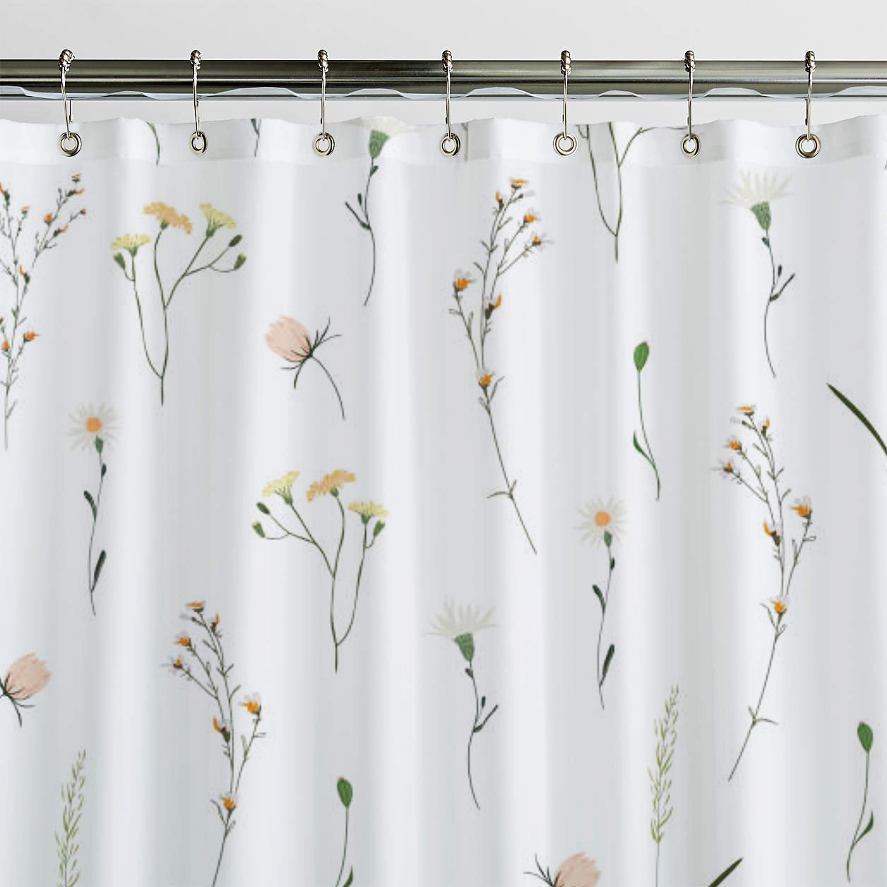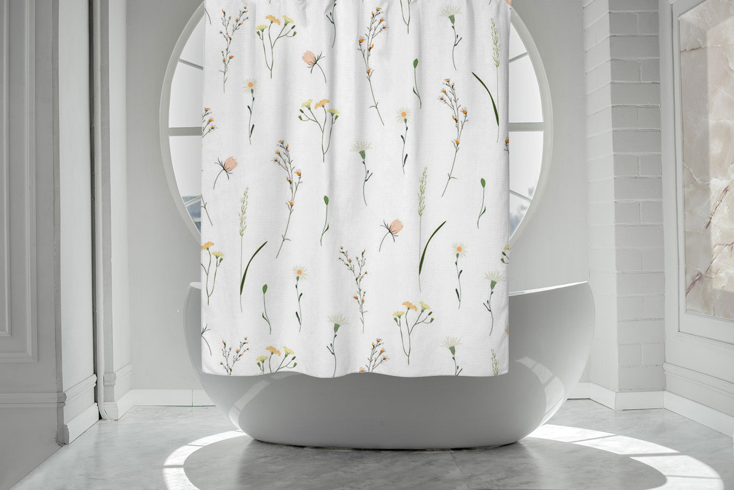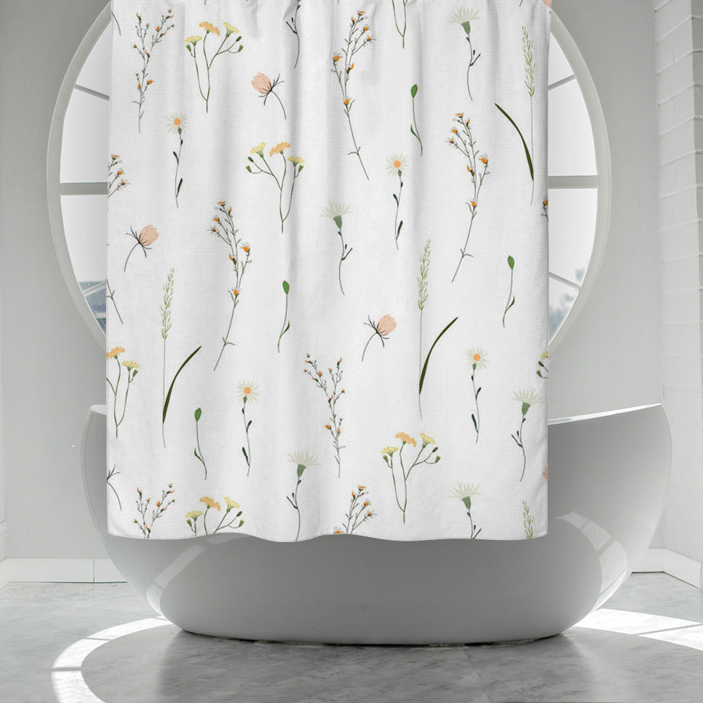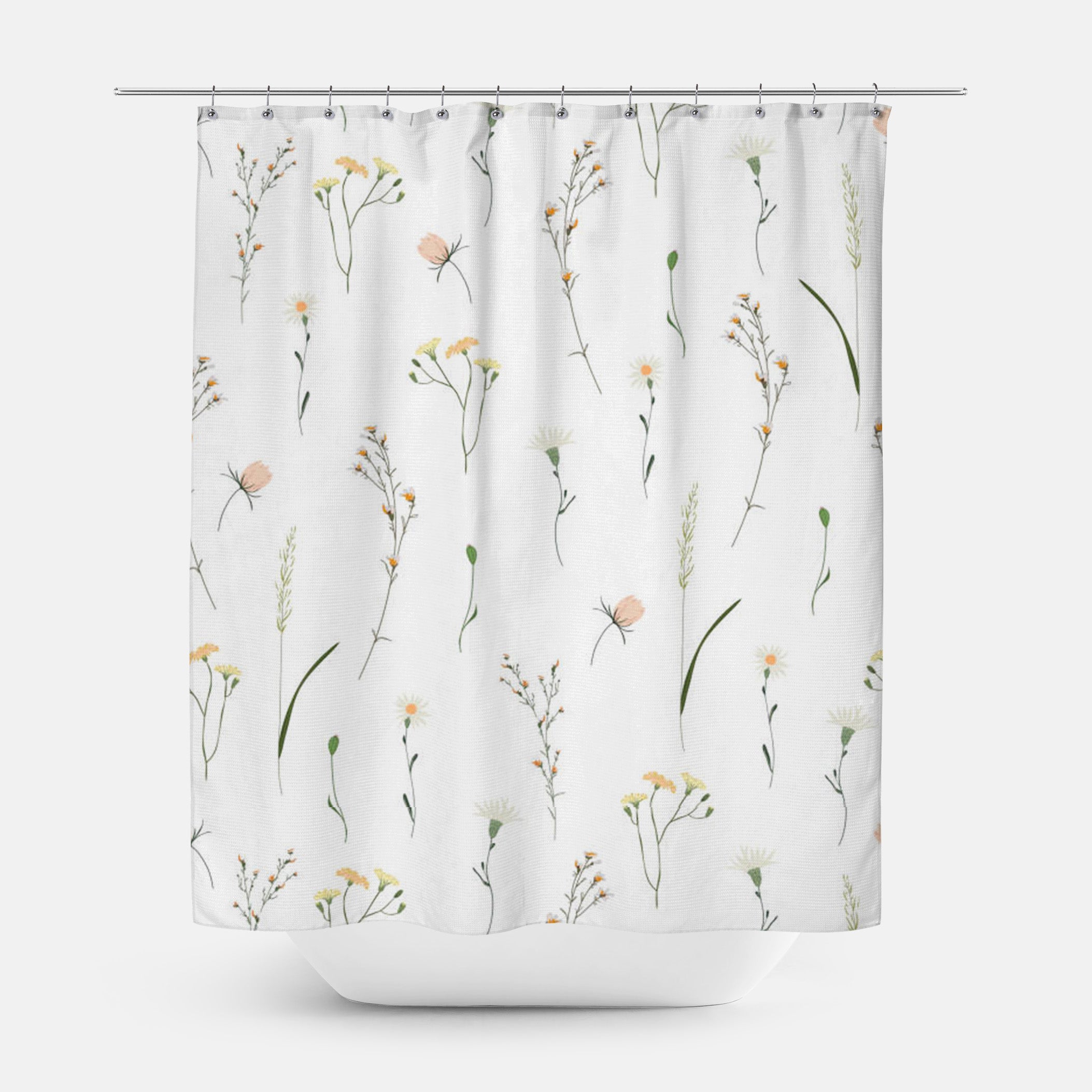 Bring an ethereal and natural touch to your bathroom with the DELIA shower curtain with a tiny wildflowers on a white background.