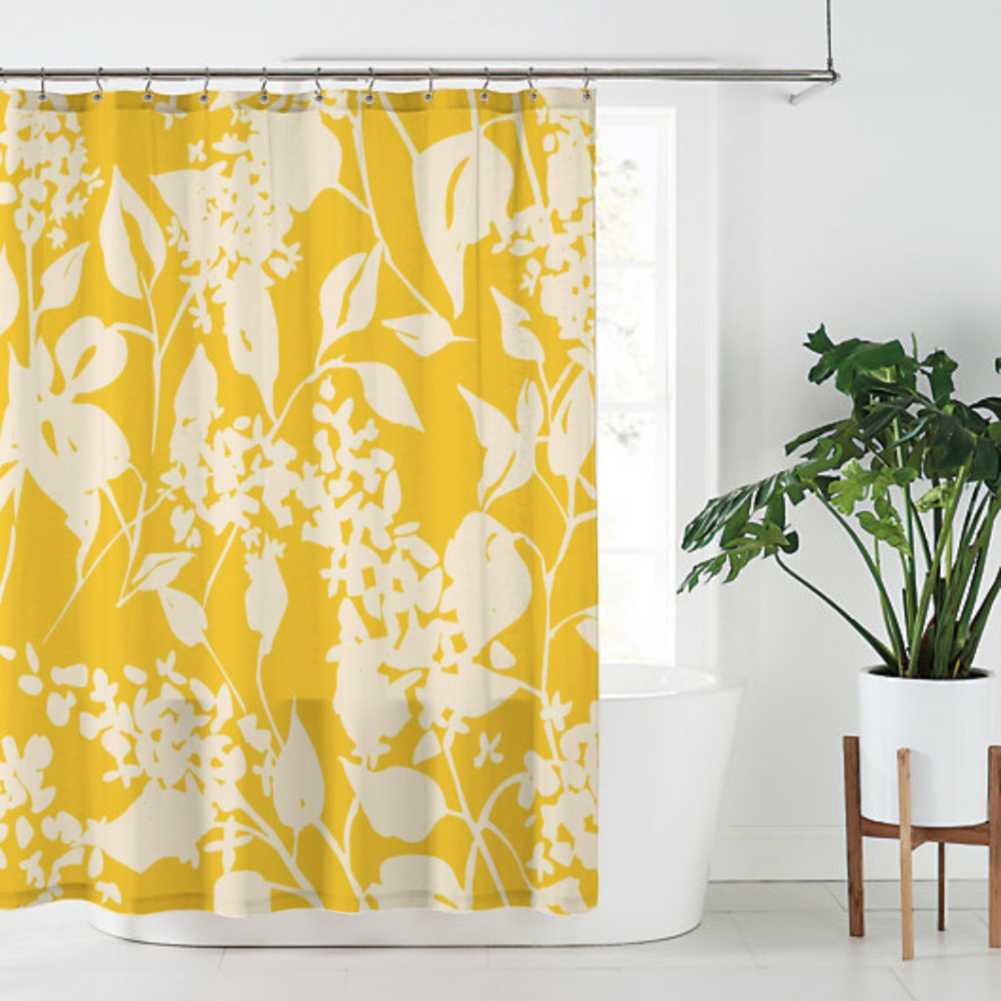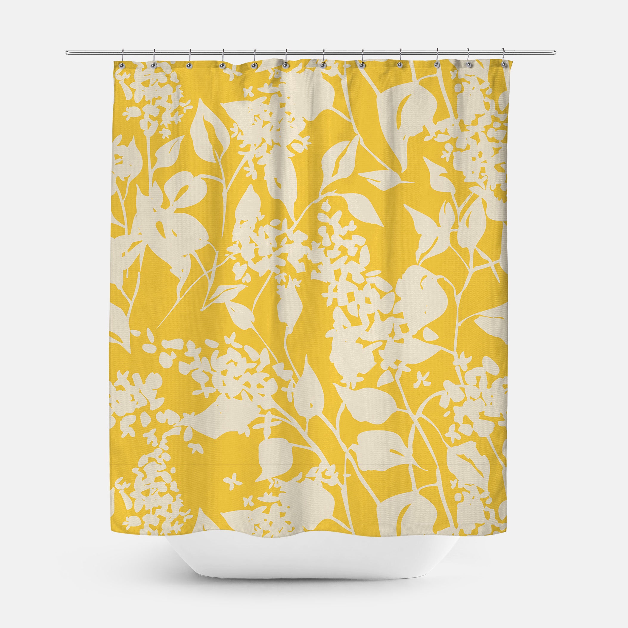 Silhouettes of lilac flowers in bloom on a vibrant and bright yellow. Simple vintage textile design, this farmhouse shower curtain will beautifully decorate your bathroom with a retro touch.