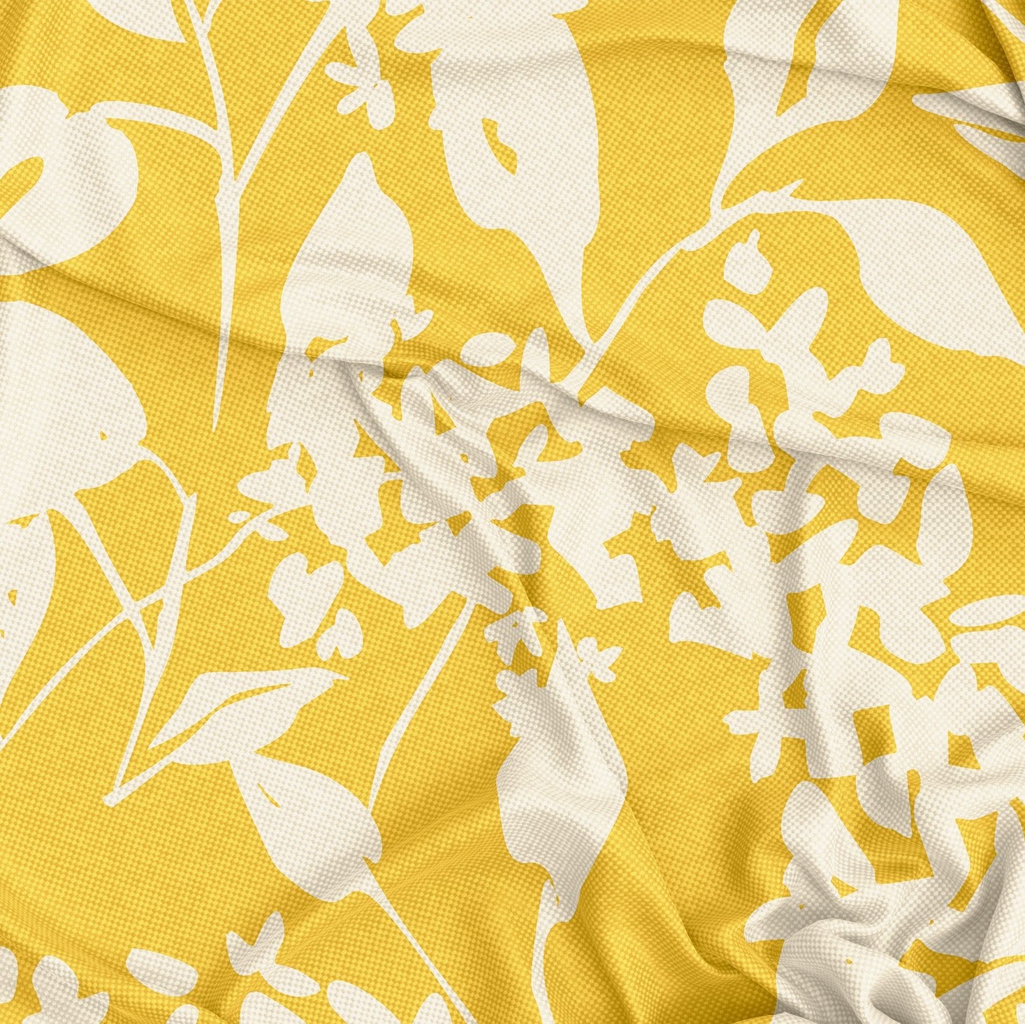 Silhouettes of lilac flowers in bloom on a vibrant and bright yellow. Simple vintage textile design, this farmhouse style tablecloth will beautifully decorate your dining room with a retro touch.