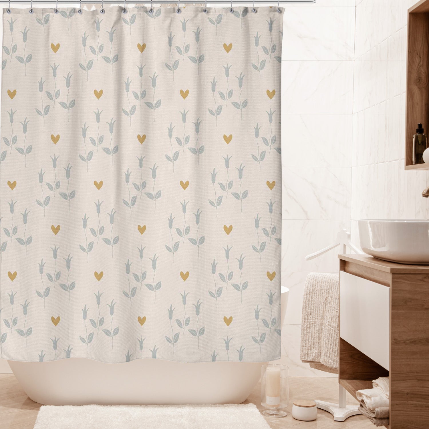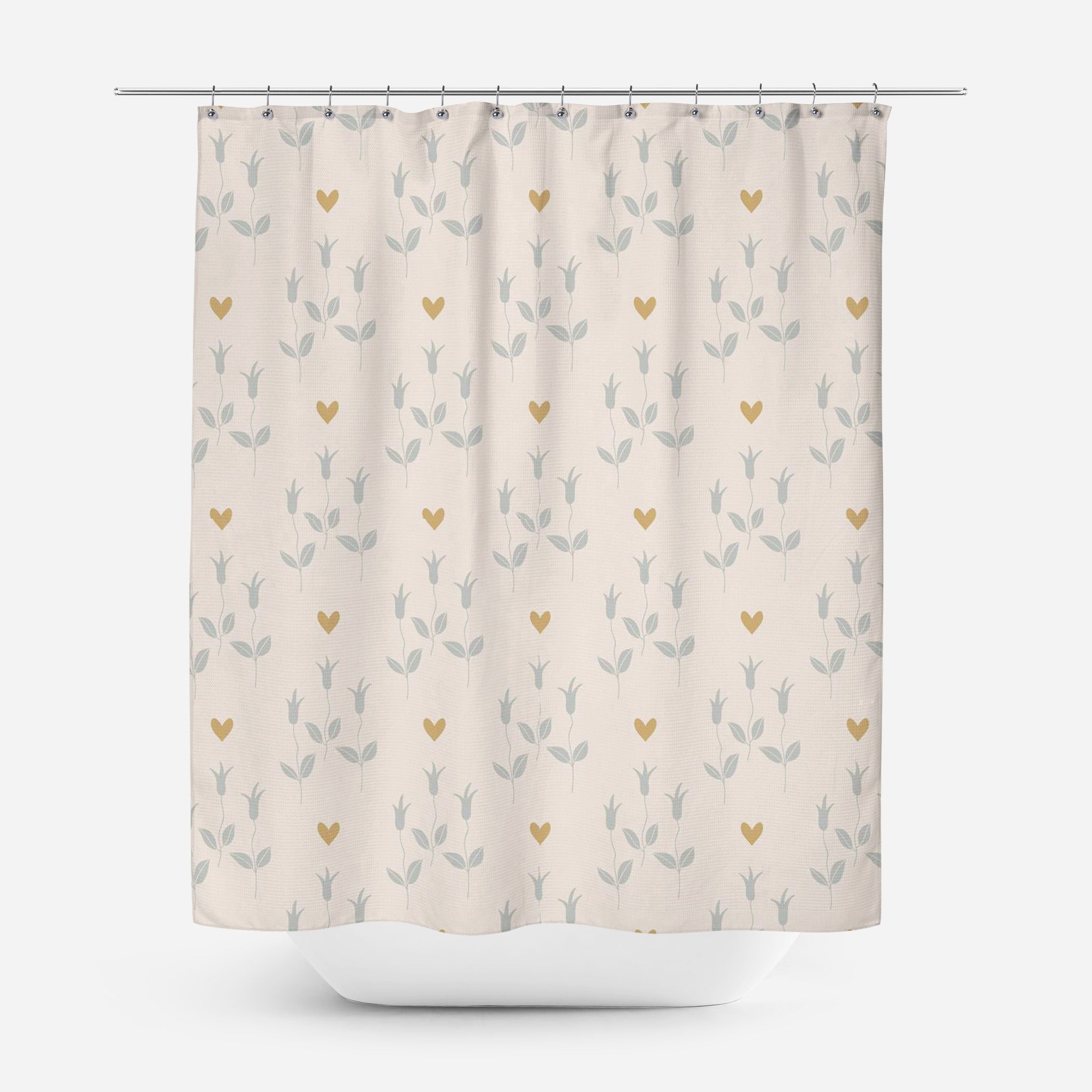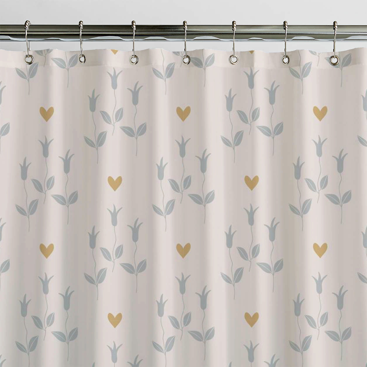 Add an elegant and romantic touch to your bathroom with the ILONA shower curtain featuring light blue wildflowers and golden hearts on a beige background. It is a beautiful addition to a family bathroom creates a warm, relaxing and welcoming space.