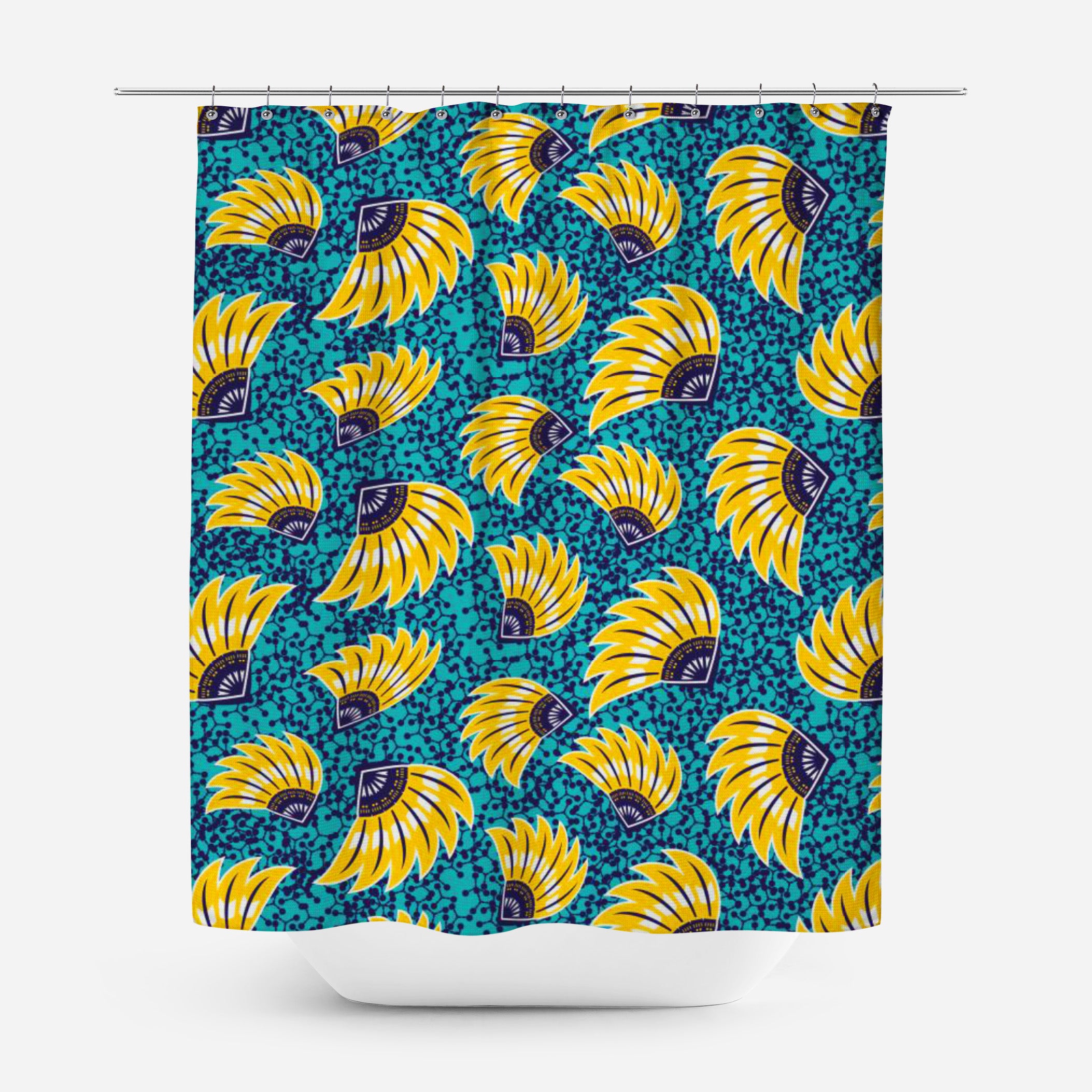 Get inspired and create a totally unique bathroom. The ANKARA shower curtain inspired by the African ethnic floral Kitenge pattern in vibrant yellow and teal blue is designed to give personality and bring joy.