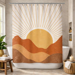 The SUNNY boho shower curtain features an abstract landscape design in warm earthy tones inspired by mountain sunsets. The soft palette brings brightness and a natural, calming atmosphere to your bathroom.
