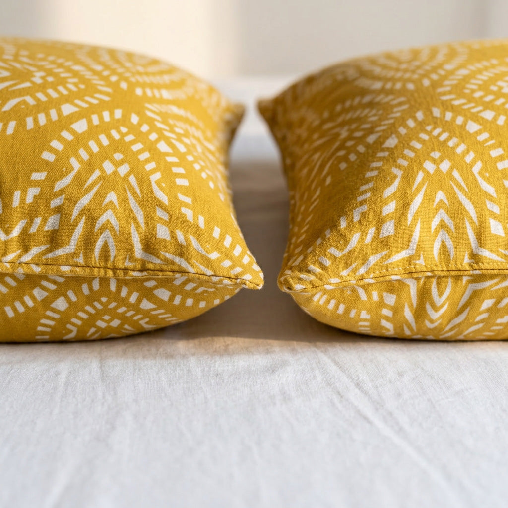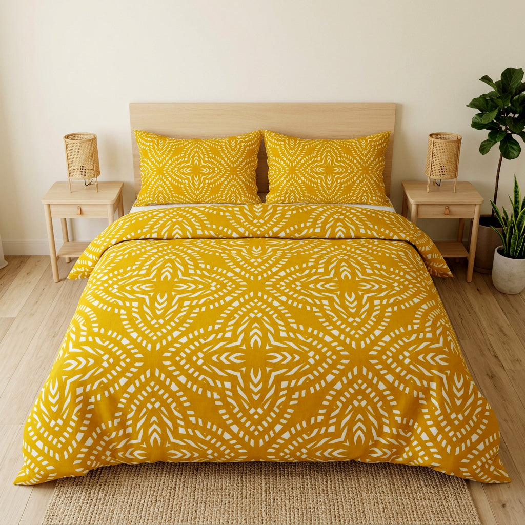 The SAMSON geometric cotton duvet cover set features a decorative pattern in warm mustard yellow tones, creating a bold and stylish look. The graphic design brings brightness and modern character to your bedroom.
