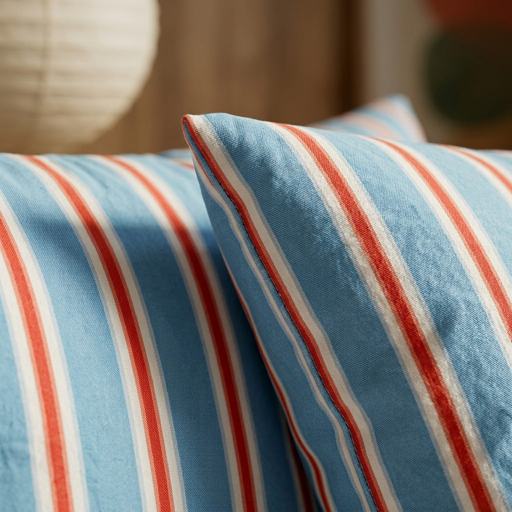 The HAVSTRIPE duvet cover set features fine vertical stripes in sky blue, white, and red, inspired by Nordic coastal living. Its clean lines and fresh palette bring a timeless Scandinavian elegance with a touch of seaside charm.
