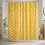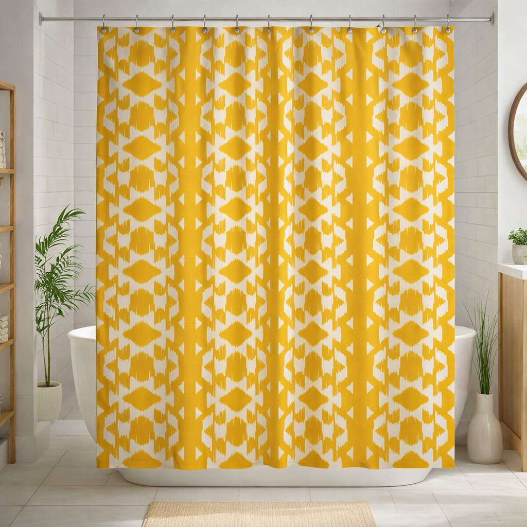 The NALA mudcloth-inspired boho shower curtain features an ethnic geometric pattern on a mustard yellow background, rooted in traditional African design. The bold motif adds warmth, contrast, and distinctive character to your bathroom.
