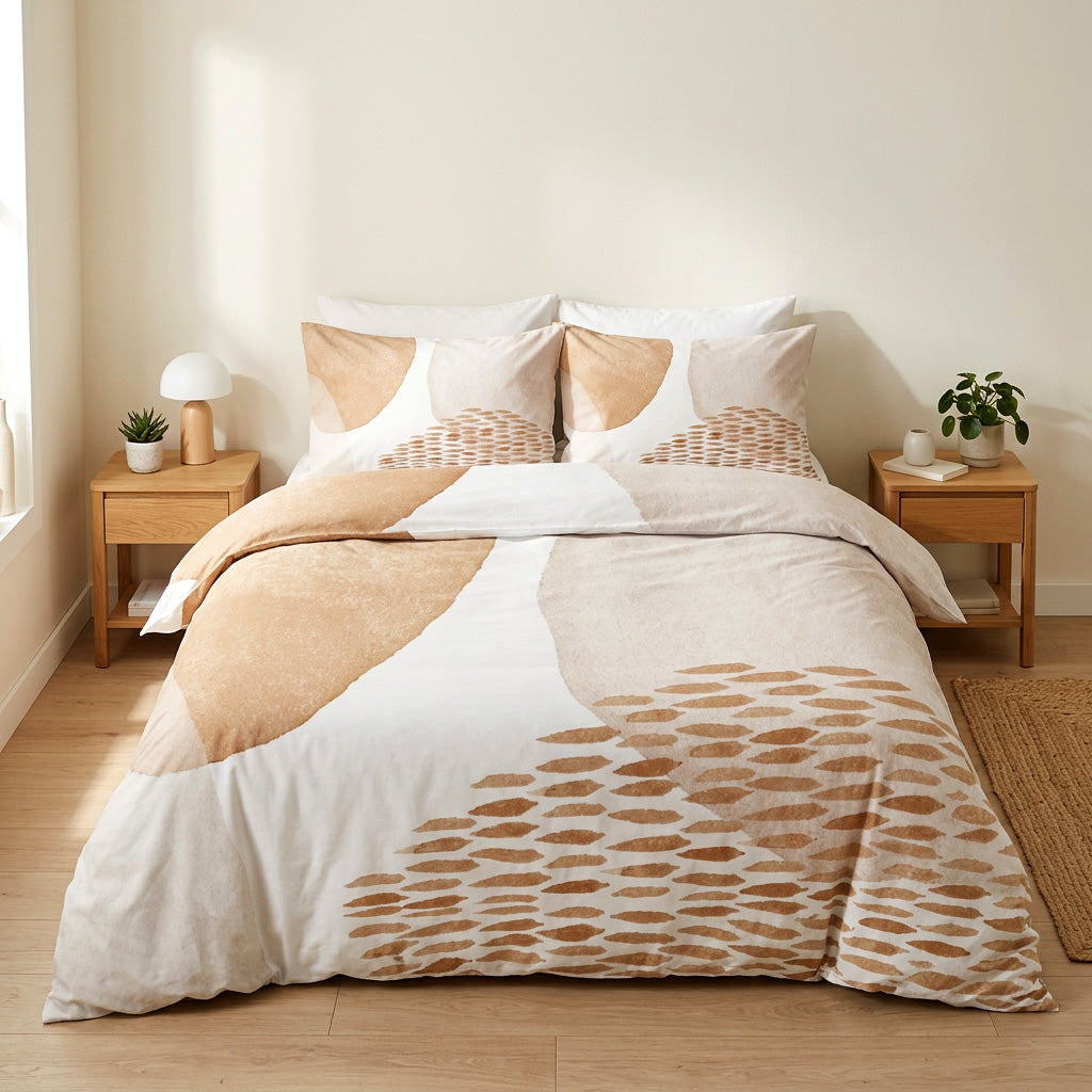 The ADELE abstract cotton duvet cover set features soft watercolor tones in ivory, white, and beige, creating a calm and elegant design. The neutral palette brings lightness and refined simplicity to your bedroom.