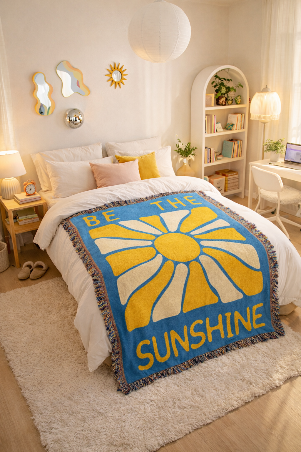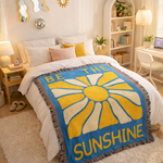 SUNSHINE knitted woven blanket features a groovy design in vintage-inspired style. Perfect to bring a little sunshine to your next couch hang.