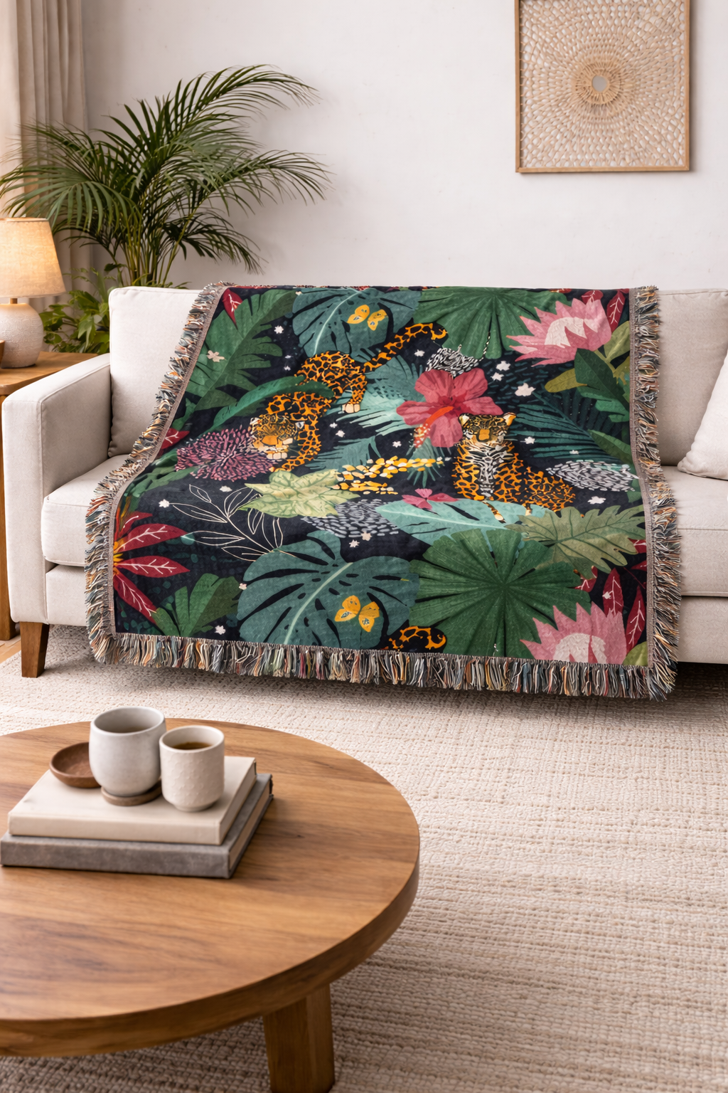 JAGUAR print knitted woven blanket with tropical jungle art.