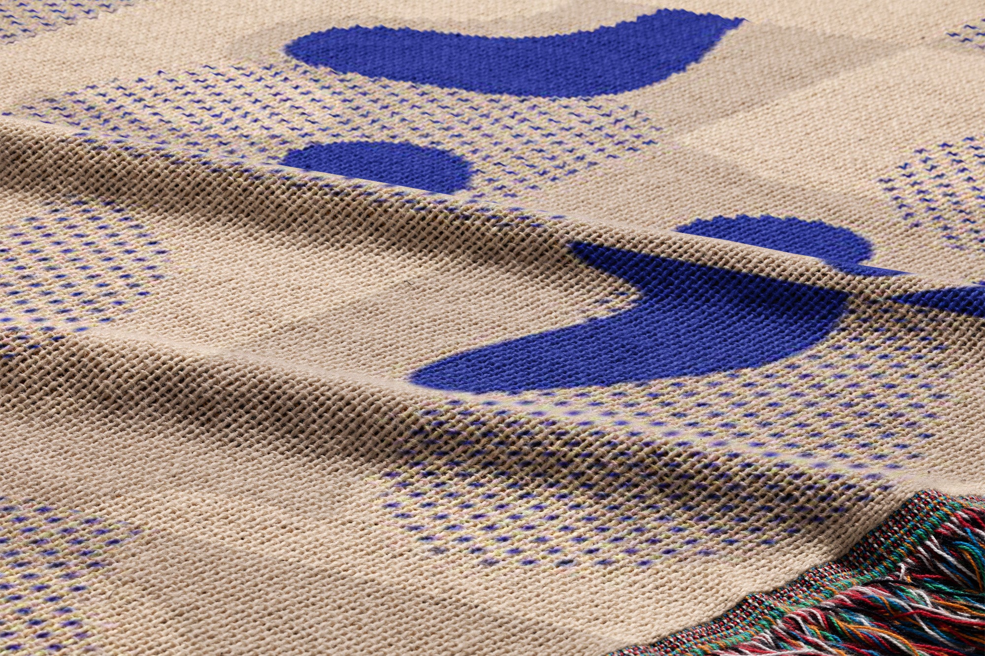 The HORIZON throw blanket combines bold Klein Blue with soft beige in a retro abstract geometric design. Its striking contrasts and woven texture create a Nordic-inspired statement piece that brings both warmth and artistic elegance to any space.
