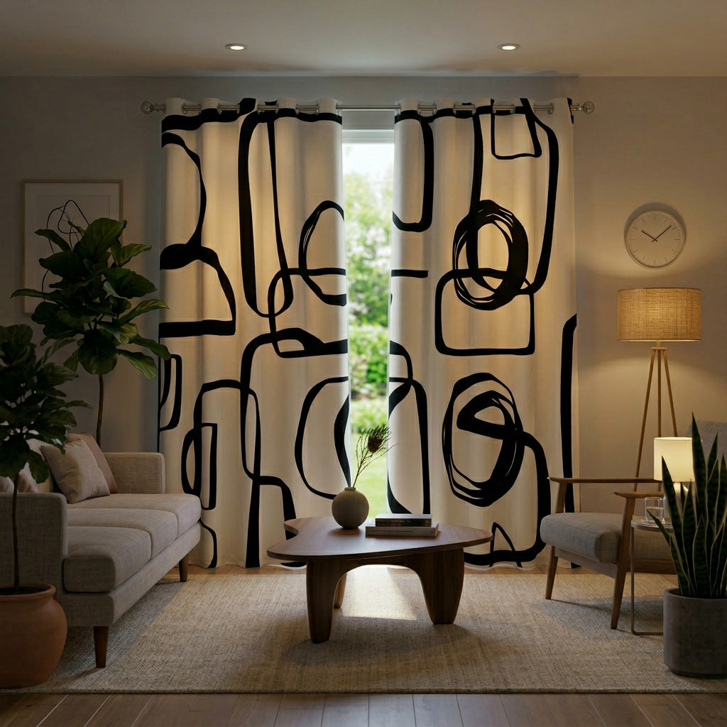 The KUMASA Mid-Century Modern geometric blackout window curtains feature a bold black and white abstract pattern that blends minimalist style with timeless retro influence. The strong contrast adds depth and graphic character to your interior.