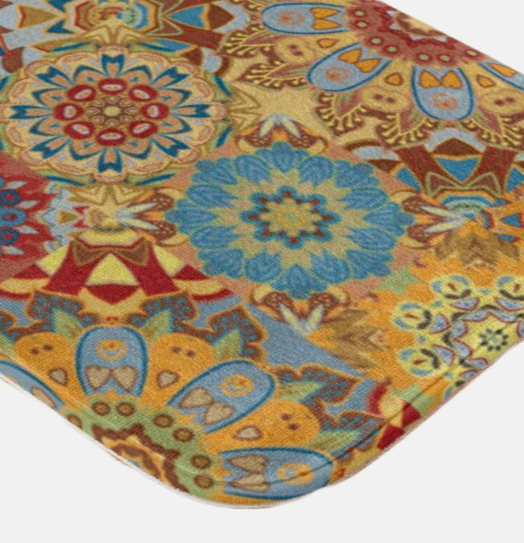 Transform your bathroom into an eclectic and bohemian space with the MANDALA boho chic bath mat featuring a gyspy patchwork floral design in warm tones.