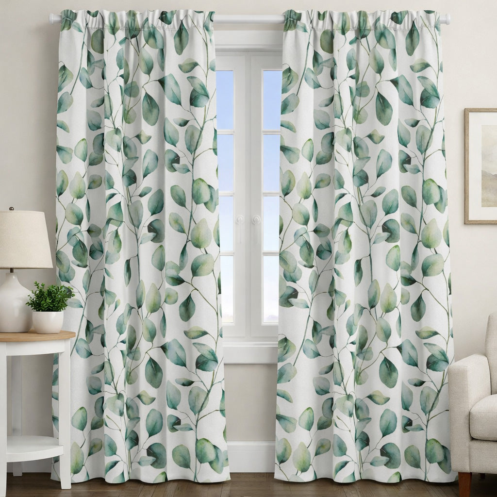 The EUCALYPTUS botanical blackout window curtain features a delicate watercolor eucalyptus leaf pattern in soft green tones. The light botanical design brings freshness and natural elegance while creating a calm, organic atmosphere.