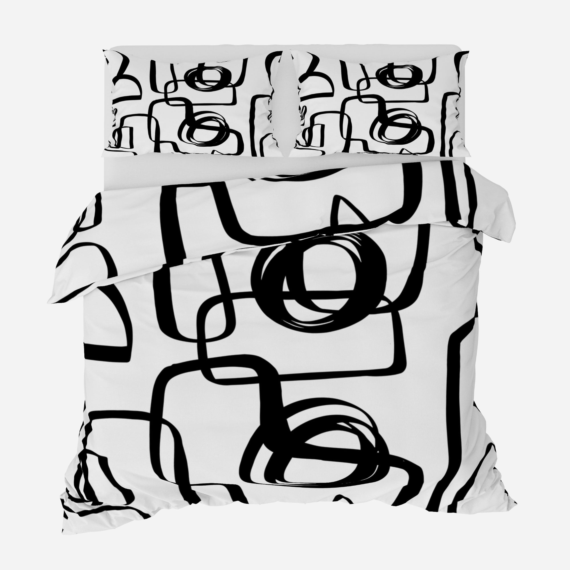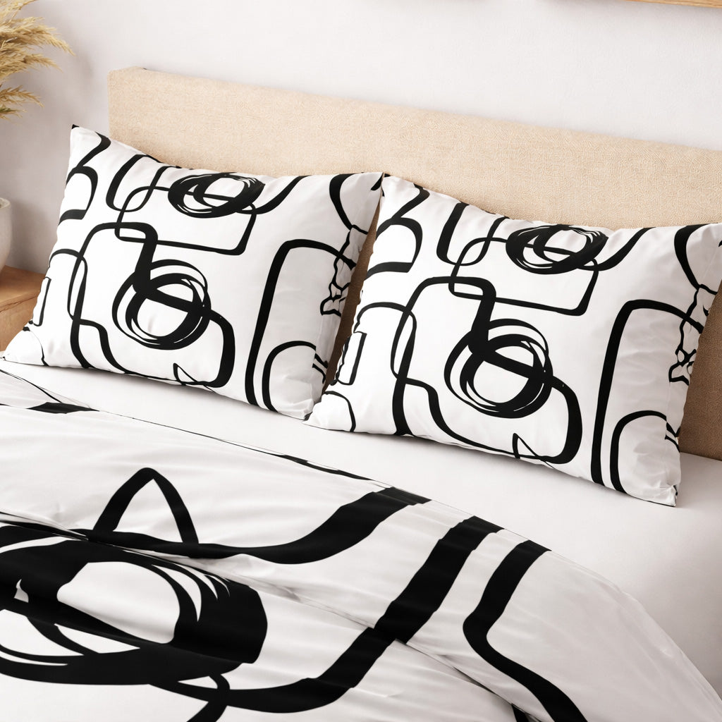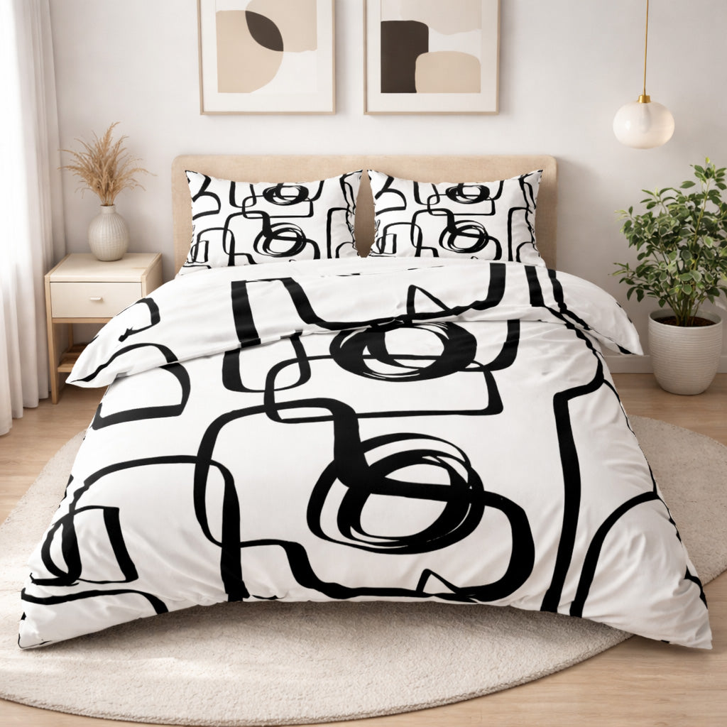 The KUMASA Mid-Century geometric cotton duvet cover set features a striking black and white abstract pattern inspired by retro design. The bold graphic contrast adds modern character and visual rhythm to your bedroom.