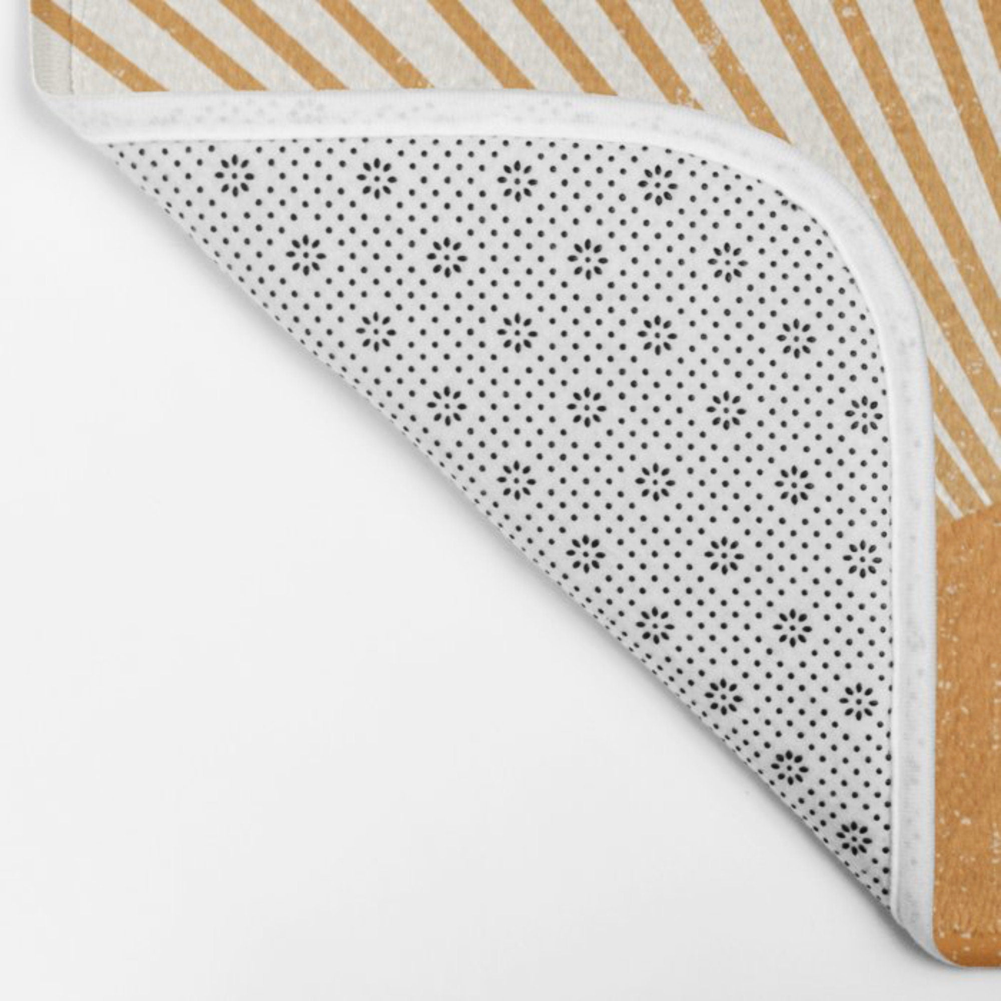 Make your bathroom shine with the SURYA boho chic bath mat with a design inspired by a bright orange sunburst of a warm landscape.