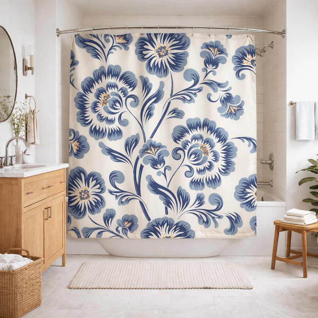 The PEONY floral shower curtain features elegant navy blue peonies on a soft cream background, creating a classic and refined design. The timeless botanical pattern adds charm and a graceful touch to your bathroom.