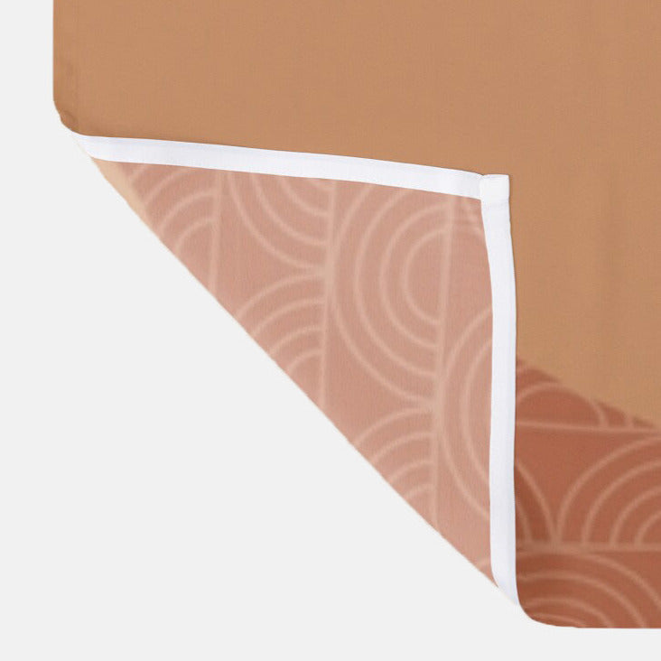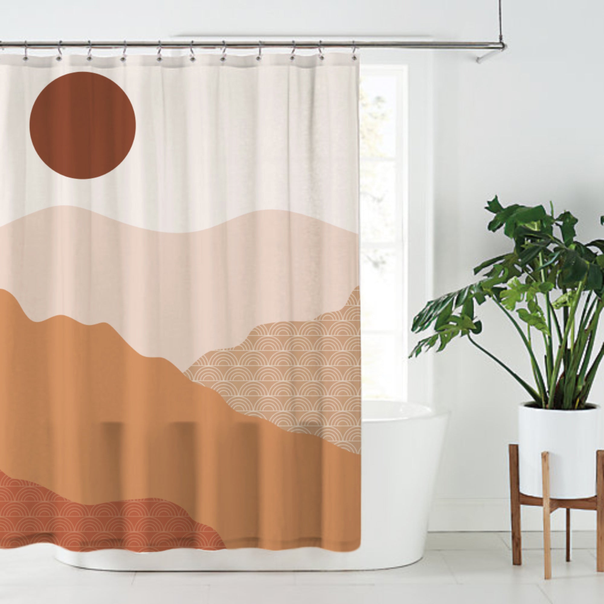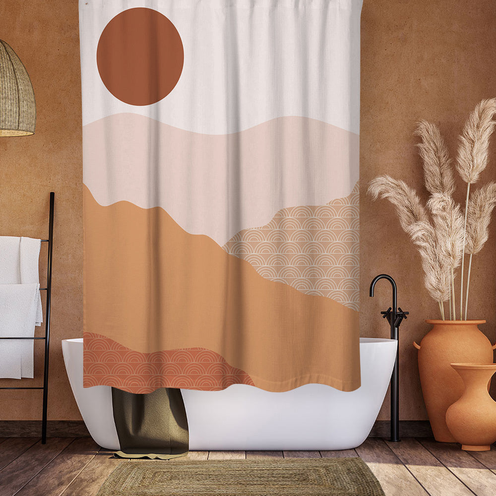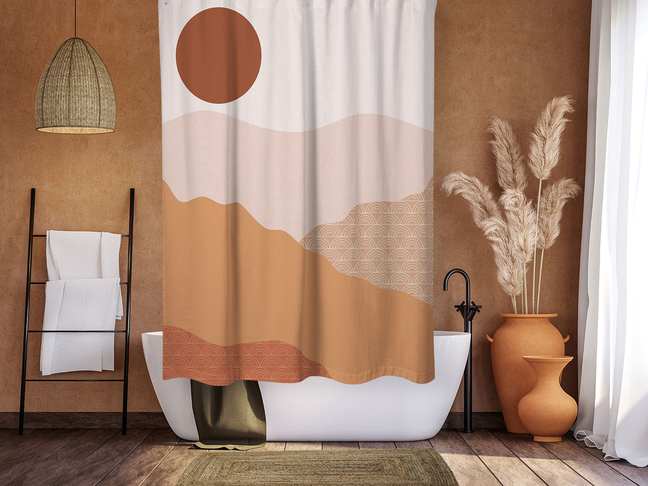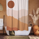 Add terracotta and earthy tones to your bathroom with the TERRAN boho shower curtain inspired by a natural and warm sunset landscape.