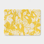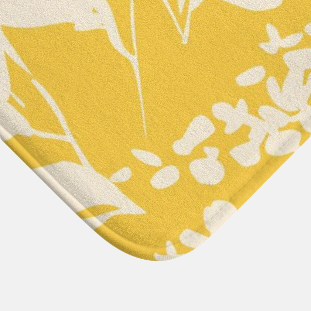 Silhouettes of lilac flowers in bloom on a vibrant and bright yellow. Simple vintage textile design, this farmhouse style bath mat will beautifully decorate your bathroom with a retro touch.