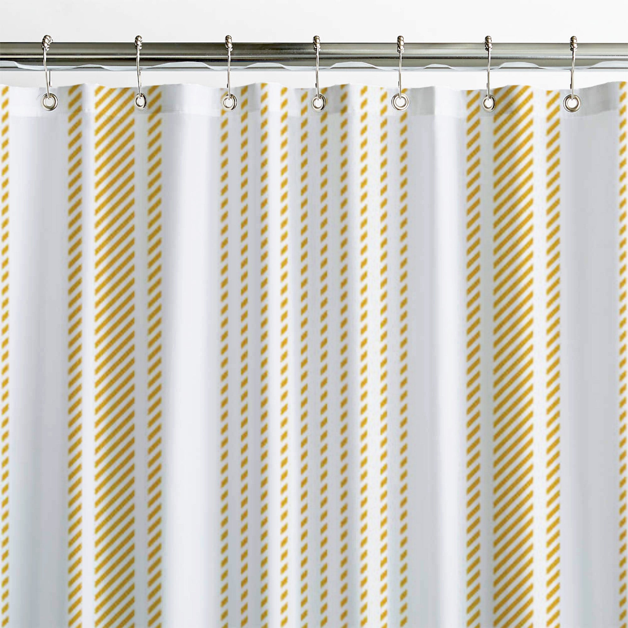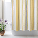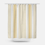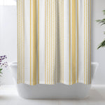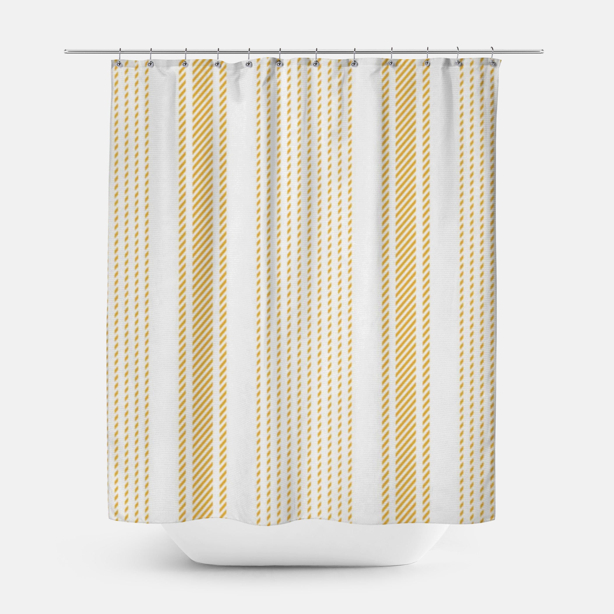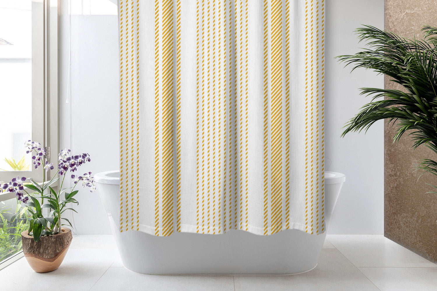 Golden yellow striped white CASSIDY shower curtain. This farmhouse shower curtain will give your bathroom a warm, relaxing and welcoming space while being elegant in its simplicity.